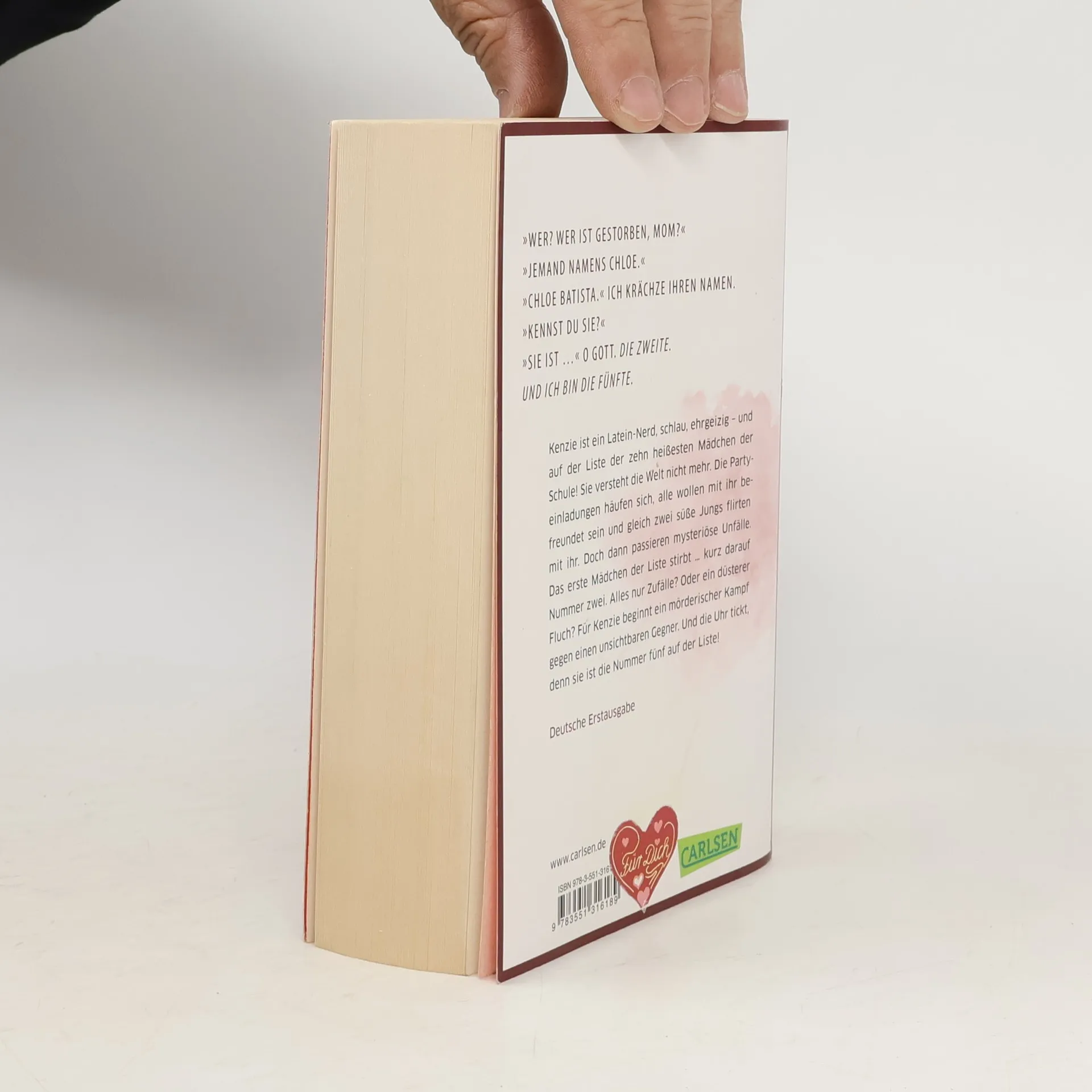 Intelligent, aufregend und atemlos spannend - ein Jugendthriller für Fans von Monika Feth und Janet Clark! Kenzie ist ein Latein-Nerd, schlau, ehrgeizig - und auf der Liste der zehn heißesten Mädchen der Schule! Sie versteht die Welt nicht mehr. Die Partyeinladungen häufen sich, alle wollen mit ihr befreundet sein und gleich zwei süße Jungs flirten sie an. Doch dann passieren mysteriöse Unfälle. Das erste Mädchen der Liste stirbt … kurz darauf Nummer 2. Alles nur Zufälle? Oder ein düsterer Fluch? Für Kenzie beginnt ein mörderischer Wettkampf gegen einen unsichtbaren Gegner. Und die Uhr tickt, denn sie ist die Fünfte! »Dieses Buch ist ein höchst süchtig machender Roman, den man nicht weglegen kann.« Literaturblog