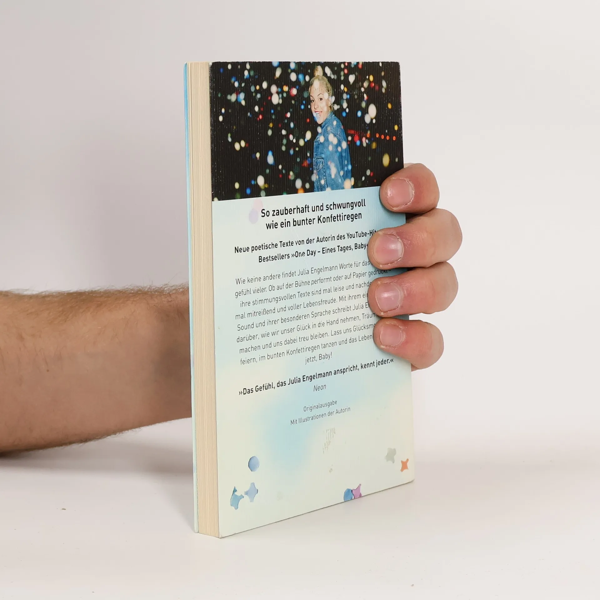 Seit ihr Slam „One Day“ ein sensationeller Interneterfolg wurde, fängt Julia Engelmann wie keine andere das Lebensgefühl einer ganzen Generation ein. Ob auf der Bühne performt oder auf Papier gedruckt – ihre Texte sind mitreißend, ehrlich und berührend. So auch in ihrem neuen Buch: Mit ihrem einzigartigen Sound und ihrer besonderen Sprache schreibt sie darüber, wie wir unser Glück in die Hand nehmen, Träume wahr machen und uns dabei treu bleiben. Lass uns Glücksmomente feiern, im bunten Konfettiregen tanzen und das Leben leben – jetzt, Baby! Ausstattung: mit farbigen Illustrationen