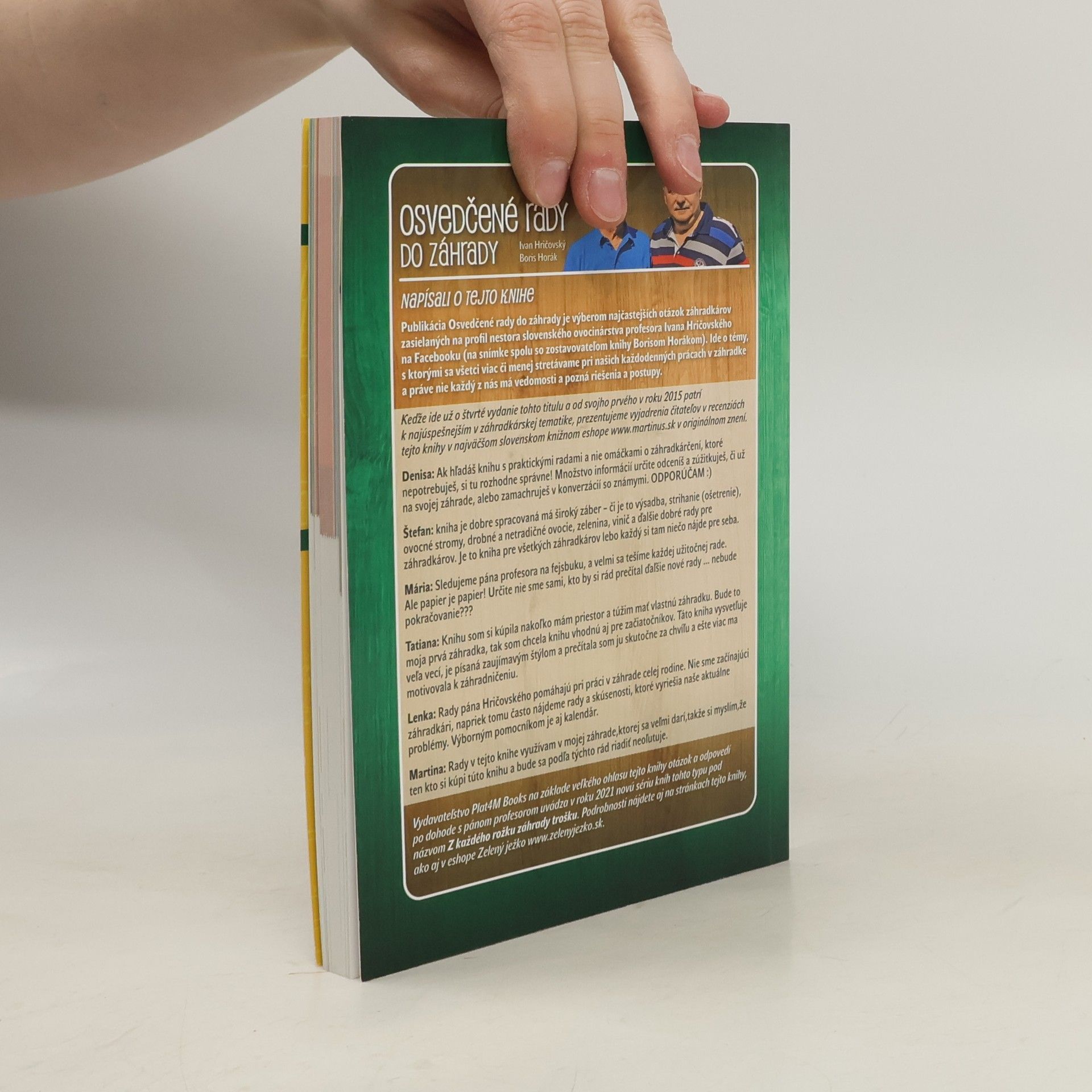 Profesor Ivan Hričovský, nestor slovenského ovocinárstva, sa pri svojich prednáškach a osobných stretnutiach často stretáva s opakujúcimi sa otázkami týkajúcimi sa záhradkárstva. Odpovede na tieto otázky, hoci cenné, zostávajú väčšinou nezapísané a strácajú sa. Doteraz chýba komplexný zborník, ktorý by zhromaždil odpovede na otázky týkajúce sa ovocných, zeleninových a okrasných záhrad. Situácie, keď nevieme, ako správne postupovať, sú bežné – od otázok o reze ovocných stromov po správne kombinácie rastlín na hriadkach. Aby pomohol, Hričovský vytvoril elektronické záhradkárske fórum, kde môžu ľudia klásť otázky a dostávať odborné odpovede. Jeho poradenský profil na Facebooku Rady.do.záhrady.profesor.Hričovský sa stal populárnym a súčasťou mnohých domácností na Slovensku a v Čechách. Okrem praktických rád, ktoré poskytuje takmer denne, má aj aktívny kontakt s mnohými záhradkármi. Pre tých, ktorí nemajú prístup k internetu, je určená táto plnofarebná knižná publikácia, ktorá zhromažďuje otázky a odpovede od priateľov na Facebooku. Kniha posúva aktivity profilu ďalej a zahŕňa aj odborné odpovede od uznávaných slovenských odborníkov v rôznych oblastiach záhradkárstva, vrátane biologickej ochrany rastlín, ovocinárstva a záhradnej architektúry.