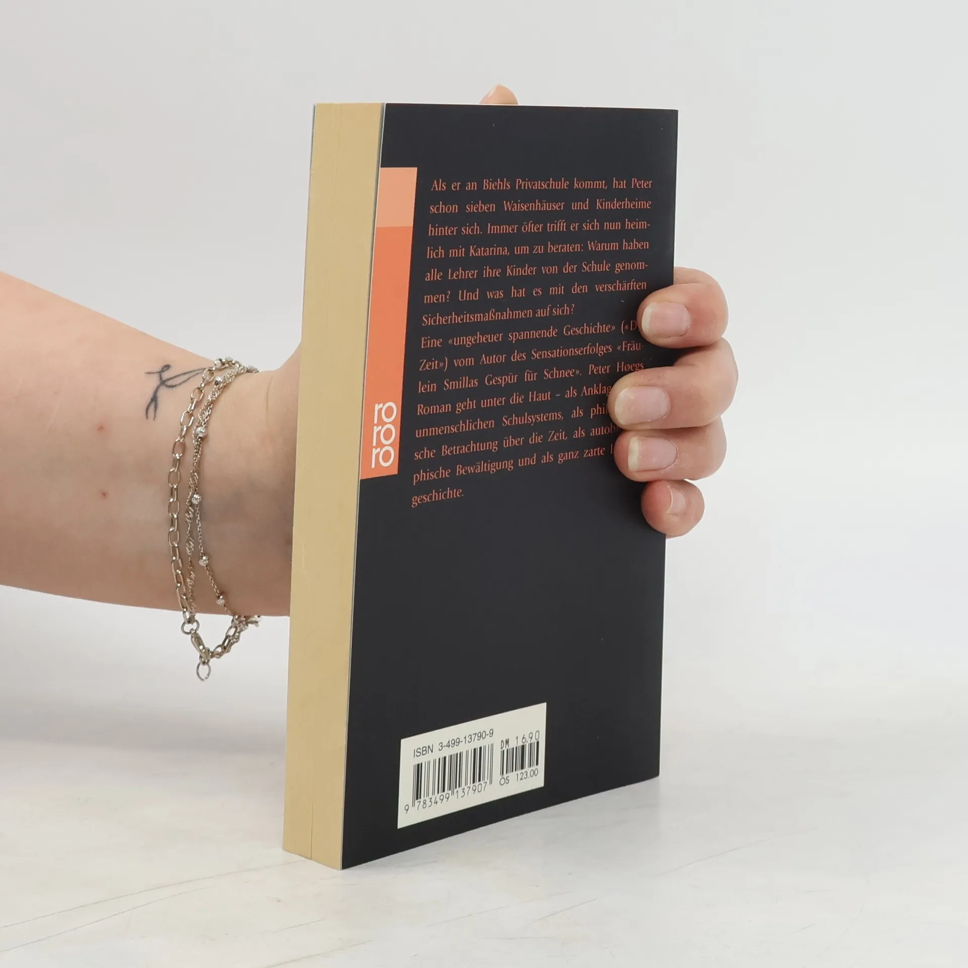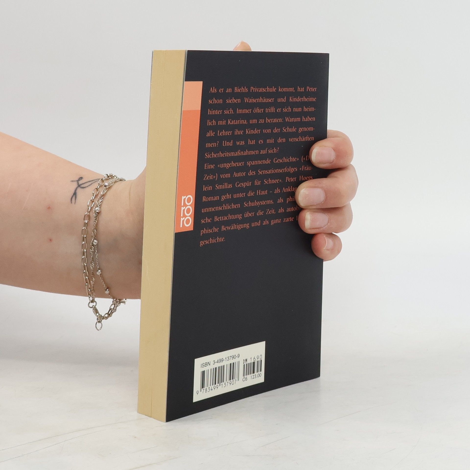 Als er an Biehls Privatschule kommt, hat Peter schon sieben Waisenhäuser und Kinderheime hinter sich. Immer öfter trifft er sich nun heimlich mit Katarina, um zu beraten: Warum haben alle Lehrer ihre Kinder von der Schule genommen ? Und was hat es mit den verschärften Sicherheitsmaßnahmen auf sich? Peter Hoegs Roman geht unter die Haut - als Anklage eines unmenschlichen Schulsystems, als philosophische Betrachtung über die Zeit, als autobiographische Bewältigung und als ganz zarte Liebesgeschichte.