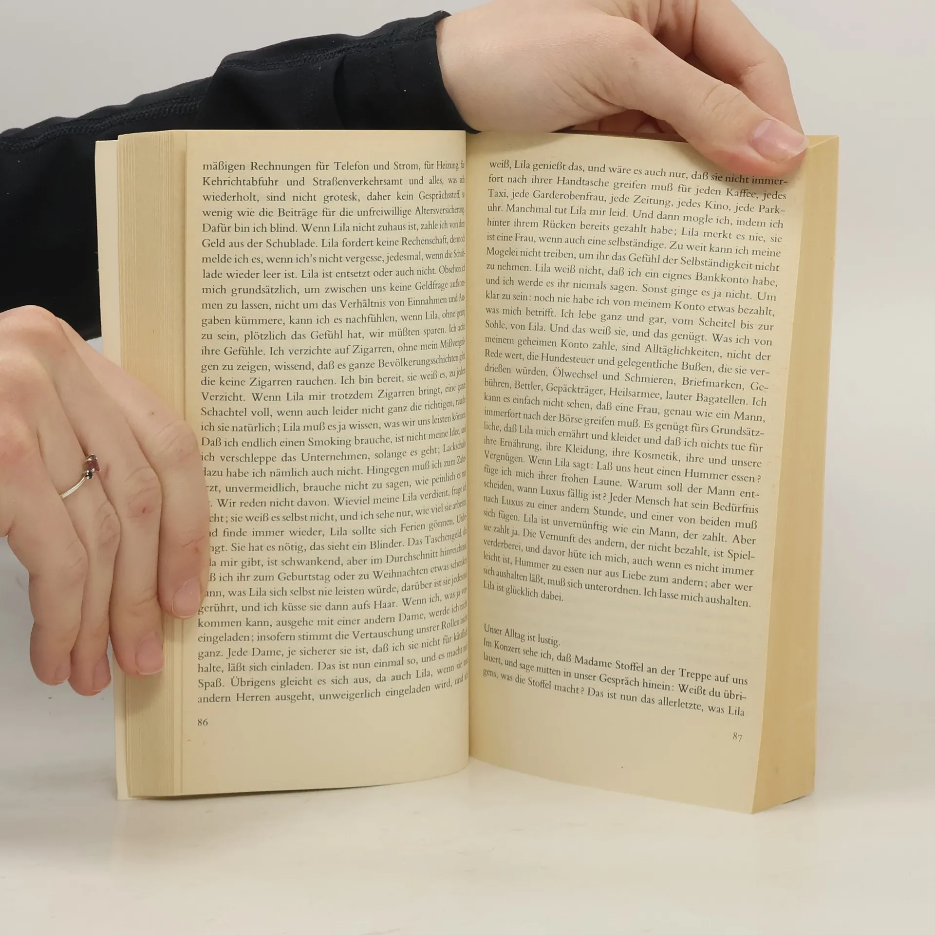 Der Erzähler erfindet (»Ich stelle mir vor:«) mögliche Lebensgeschichten dreier Personen: Da ist Gantenbein, der einen Blinden spielt, um so genauer seine Umwelt beobachten zu können. Oder da ist Enderlin, der immer »ein fremder Herr« bleibt. Auch Svoboda muß die Erfahrung machen, daß Liebe und Ehe endlich sind. Übrig im Spiel der erdichteten Rollen bleibt: Gantenbein.