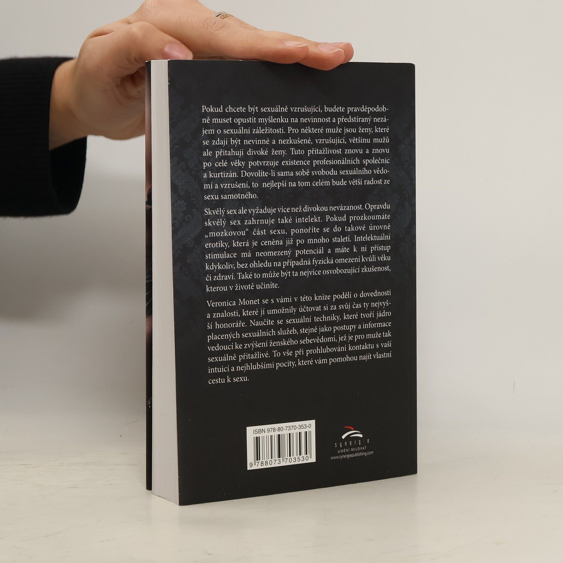 Veronica Monet se s vámi v této knize podělí o dovednosti a znalosti, které jí umožnily účtovat si za svůj čas ty nejvyšší honoráře. Naučíte se sexuální techniky, které tvoří jádro placených sexuálních služeb, stejně jako postupy a informace vedoucí ke zvýšení ženského sebevědomí, jež je pro muže tak sexuálně přitažlivé. To vše při prohlubování kontaktu s vaší intuicí a nejhlubšími pocity, které vám pomohou najít vlastní cestu k sexu. Pokud chcete být sexuálně vzrušující, budete pravděpodobně muset opustit myšlenku na nevinnost a předstíraný nezájem o sexuální záležitosti. Pro některé muže jsou ženy, které se zdají být nevinné a nezkušené, vzrušující, většinu mužů ale přitahují divoké ženy. Tuto přitažlivost znovu a znovu po celé věky potvrzuje existence profesionálních společnic a kurtizán. Dovolíte-li sama sobě svobodu sexuálního vědomí a vzrušení, to nejlepší na tom celém bude větší radost ze sexu samotného.