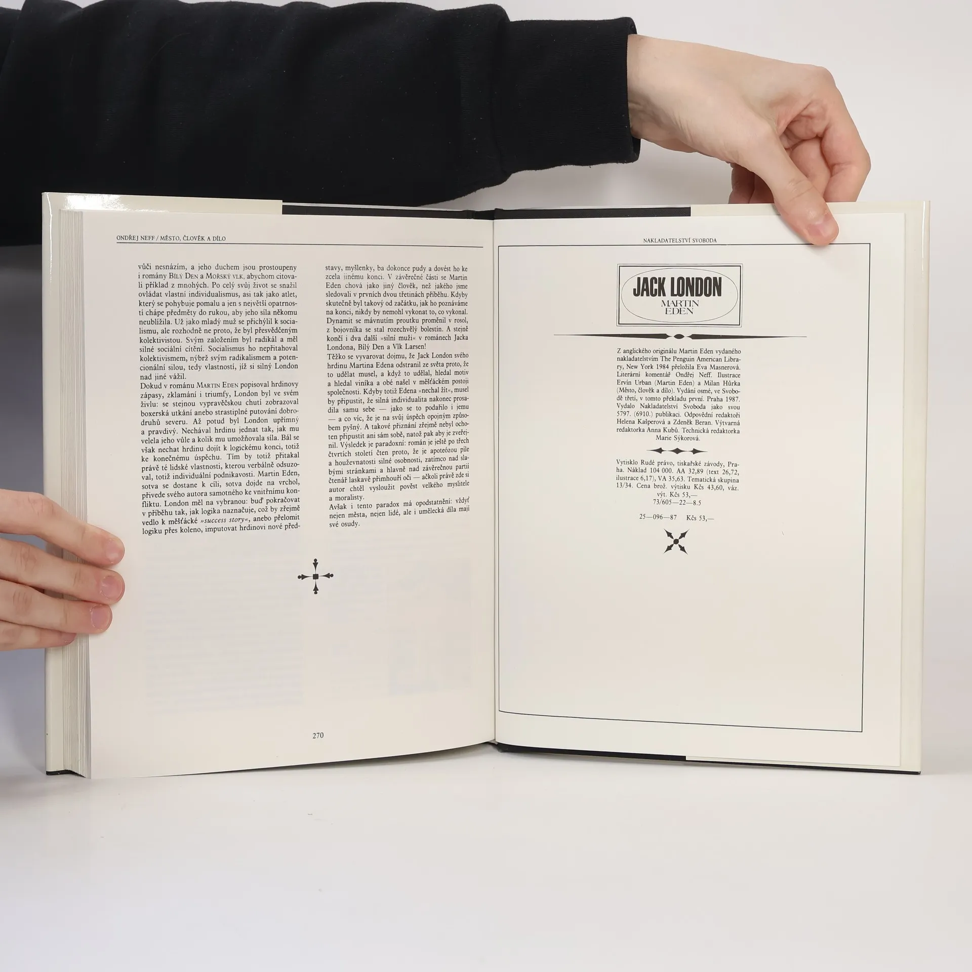 Kniha vyšla v Nakladatelství Svoboda ke 110. výročí narození autora. Kniha je doplněná krásnými ilustracemi (Ervín Urban) a literárním komentářem Ondřeje Neffa. Příběh muže, který se pokusil zvítězit nad vlastní nevědomostí a v tom zápase uspěl. Příběh muže, který se pokusilzvítězit nad nevědomostí těch druhých a v tom zapase podlehl... V románu o mladém námořnikovi Martinu Edenovi nalezneme zpověd Jacka Londona, jeho svěděctví o velké touze po úspěchu a ještě větším zklamání, jež zakusil... Když poznal jaka marnost plyne ze slávy... Jack London zde podal obraz doby svého mládi, té doby, kdy skončila pionýrská éra Nového světa a kdy začínala epocha jiná, neromantická, avšak ve svých důsledcích mnohem krutější, než kdy bývala doba pušky a madla. přeloženo z vydání The Penguin American Library, New York, 1984 8. vydání, Svoboda: 3., v tomto překladu: 1.