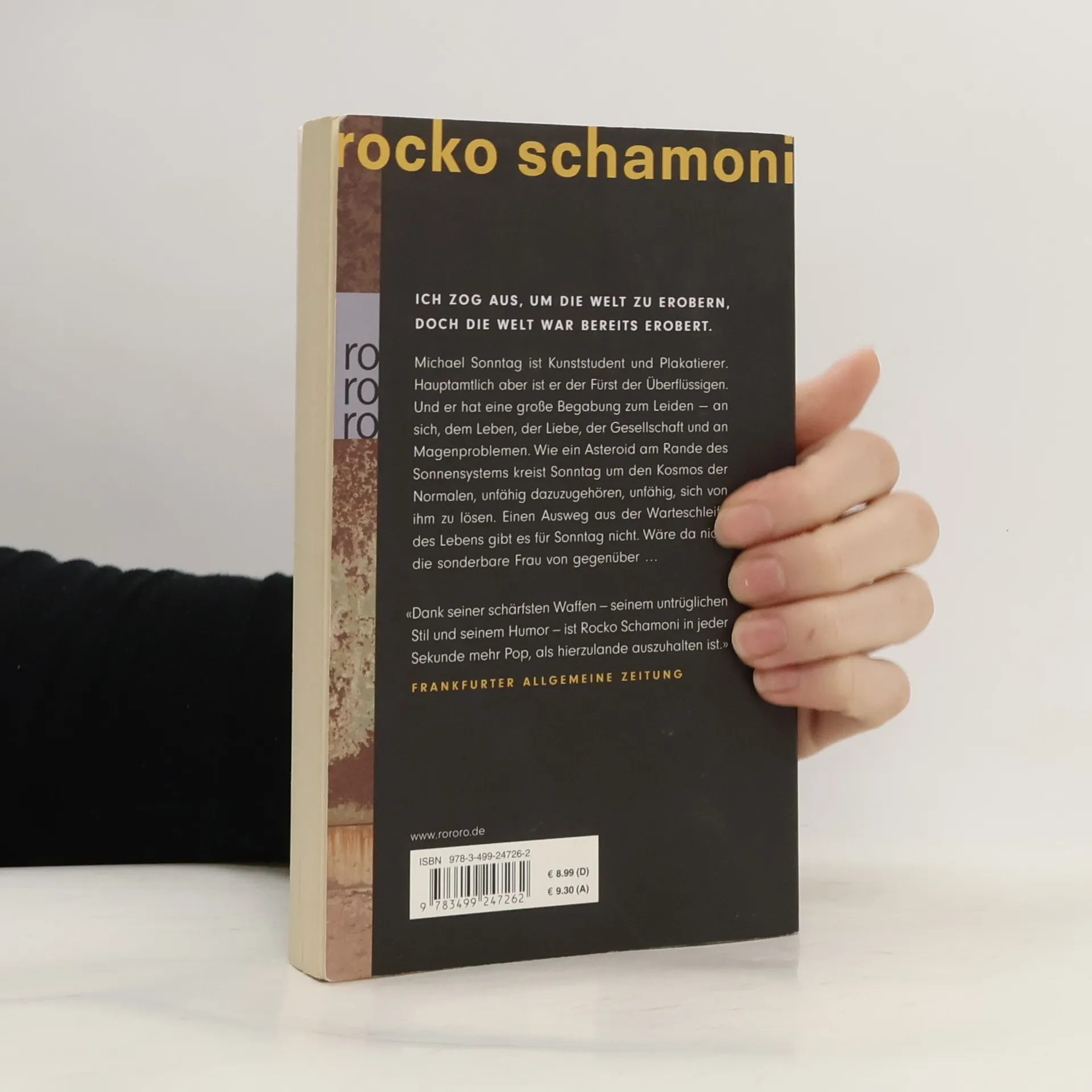 Ich zog aus, um die Welt zu erobern, doch die Welt war bereits erobert. Michael Sonntag ist Kunststudent und Plakatierer. Hauptamtlich aber ist er der Fürst der Überflüssigen. Und er hat eine große Begabung zum Leiden – an sich, dem Leben, der Liebe, der Gesellschaft und an Magenproblemen. Wie ein Asteroid am Rande des Sonnensystems kreist Sonntag um den Kosmos der Normalen, unfähig dazu zu gehören, unfähig sich von ihm zu lösen. Einen Ausweg aus der Warteschleife des Lebens gibt es für Sonntag nicht. Wäre da nicht die sonderbare Frau von Gegenüber... „Dank seiner schärfsten Waffen – seinem untrüglichen Stil und seinem Humor – ist Rocko Schamoni in jeder Sekunde mehr Pop, als hierzulande auszuhalten ist.“ (Frankfurter Allgemeine Zeitung)