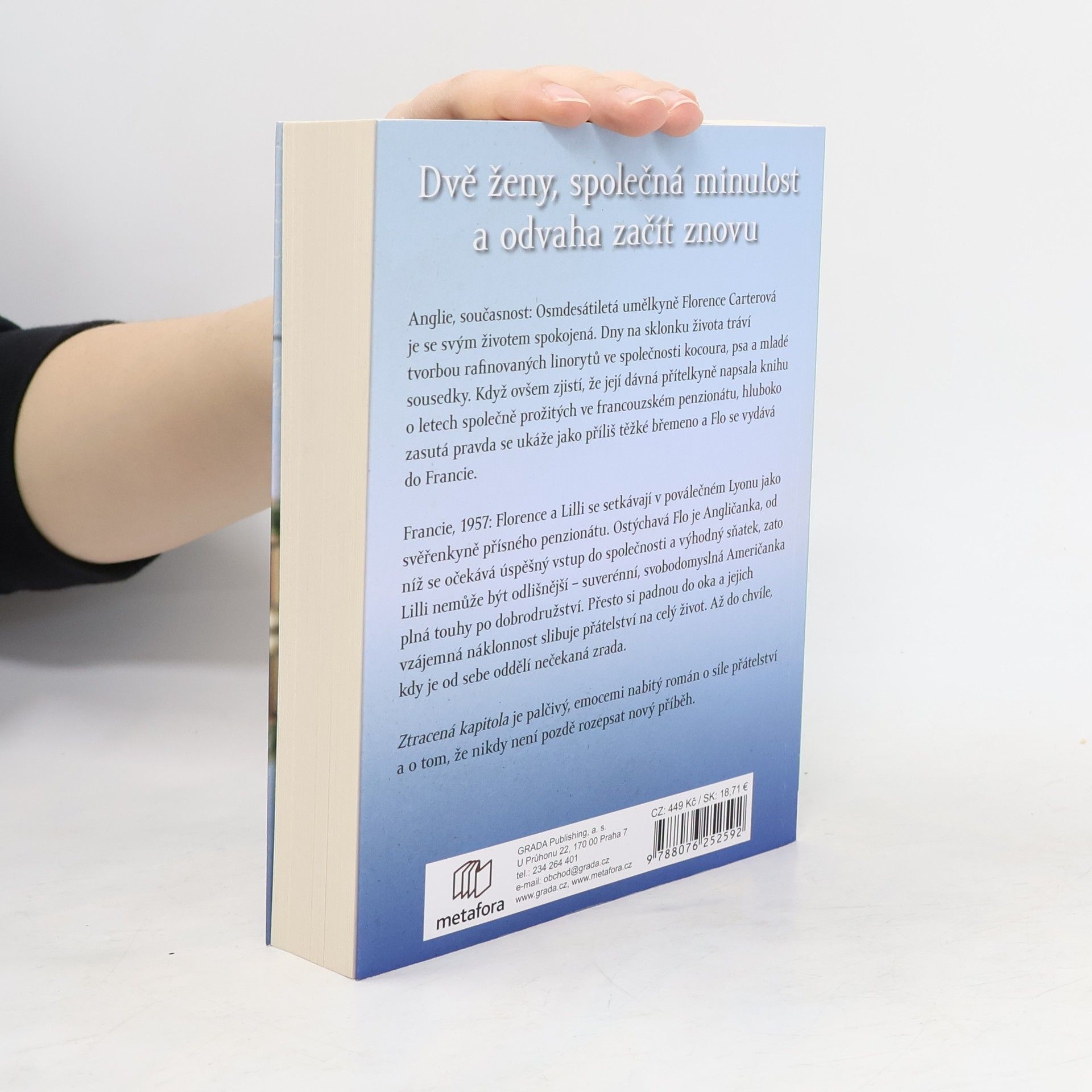Anglie, současnost: Osmdesátiletá umělkyně Florence Carterová je se svým životem spokojená. Dny na sklonku života tráví tvorbou rafinovaných linorytů ve společnosti kocoura, psa a mladé sousedky Alice, tiché a úzkostné dívky. Když ovšem Flo zjistí, že její dávná ztracená přítelkyně vydala knihu o letech společně prožitých ve francouzském penzionátu, cítí povinnost odhalit roušku tajemství z minulosti a vydává se v doprovodu Alice a její matky do Francie. Po příjezdu do Lyonu se však hluboko zasutá pravda ukáže jako příliš těžké břemeno. Francie 1957: Florence a Lili se setkávají v poválečném Lyonu jako svěřenkyně přísně vedeného penzionátu pro dívky. Flo je ostýchavé děvče z Anglie, od něhož se očekává úspěšný vstup do společnosti a pak i výhodný sňatek. Lili je její pravý opak – suverénní Američanka se svobodnou duší, plná touhy po dobrodružství. Navzdory všemu se z dívek stanou nerozlučné kamarádky, jejichž vzájemná náklonnost slibuje přátelství na celý život… než je od sebe oddělí nečekaná zrada. Ztracená kapitola je palčivý, emocemi nabitý román o síle přátelství. Jeho poselstvím je zpráva, že nikdy není pozdě rozepsat nový příběh.