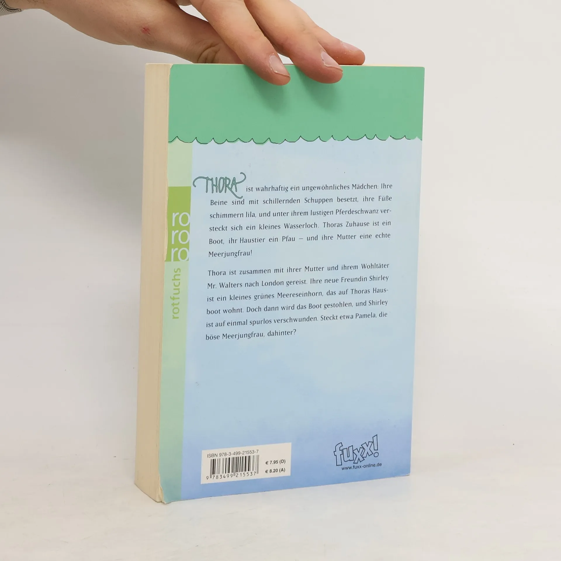 Thora ist wahrhaftig ein ungewöhnliches Mädchen: Ihre Beine sind mit schillernden Schuppen besetzt, ihre Füße schimmern lila, und unter ihrem lustigen Pferdeschwanz versteckt sich ein kleines Wasserloch. Thoras Zuhause ist ein Boot, ihr Haustier ein Pfau – und ihre Mutter eine echte Meerjungfrau! Thora ist zusammen mit ihrer Mutter und ihrem Wohltäter Mr. Walters nach London gereist. Ihre neue Freundin Shirley ist ein kleines grünes Meereseinhorn, das auf Thoras Hausboot wohnt. Doch dann wird das Boot gestohlen, und Shirley ist auf einmal spurlos verschwunden. Steckt etwa Pamela, die böse Meerjungfrau, dahinter?