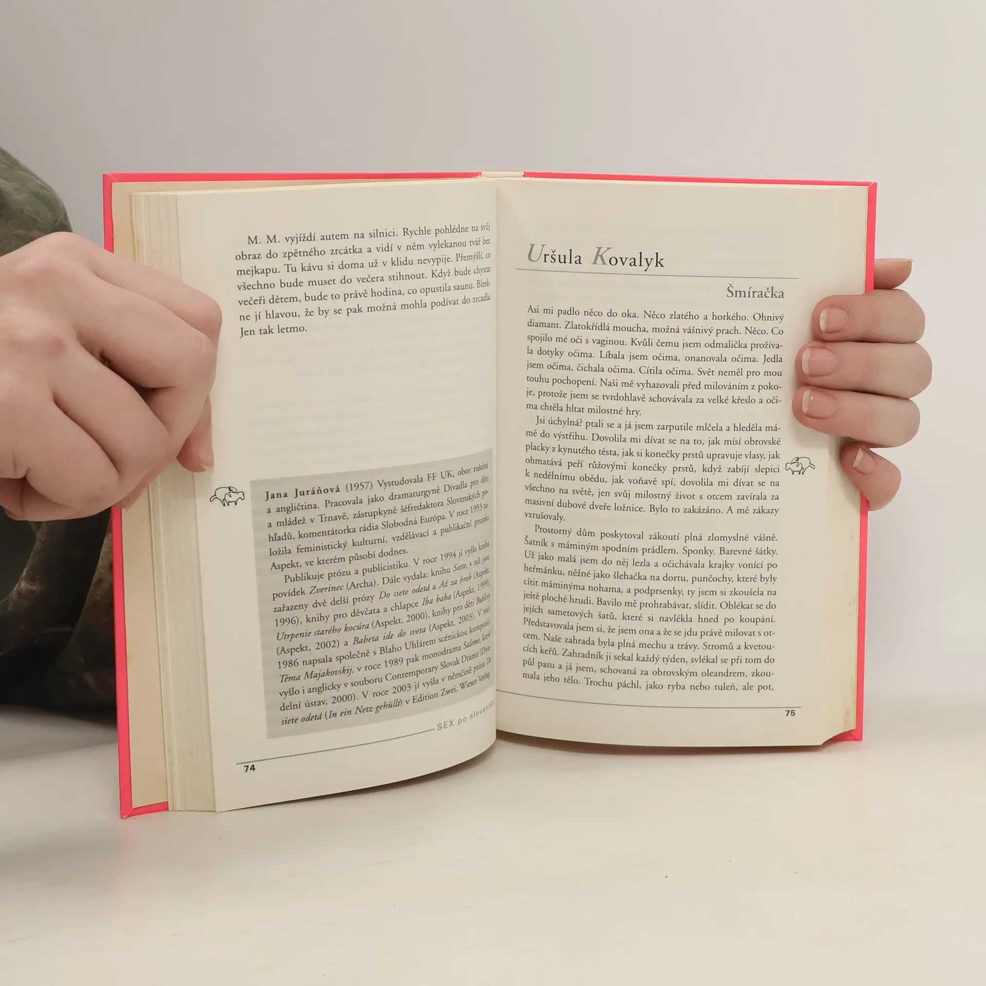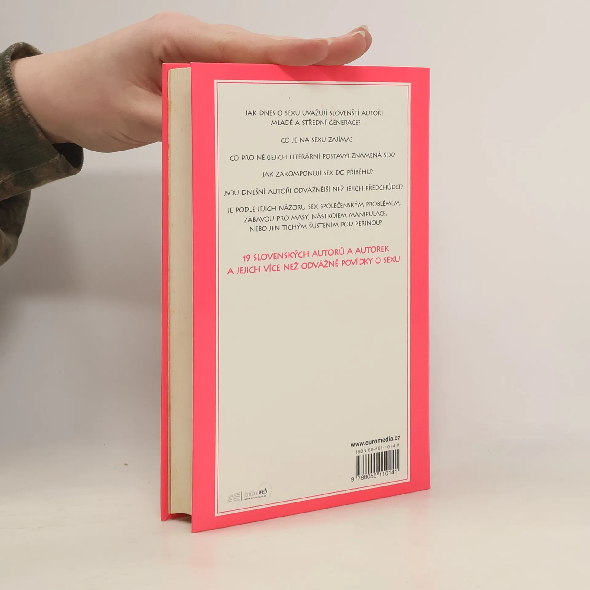 Osm Slovenek a jedenáct Slováků převážně mladší spisovatelské generace sepsalo na objednávku do této antologie své povídkové varianty na téma sex. Malé příběhy rozebírají sex z mnoha úhlů, od jemnosti až po nevázanou vášeň, od ironického nadhledu k nostalgii. Texty se většinou vyznačují originalitou pohledu a autorskou dovedností; úspěšně zastupují současnou slovenskou literární produkci na poli tak rozmanitém, jak jen dané téma může být. Čtení vtipné, k úsměvu i k pohoršení.