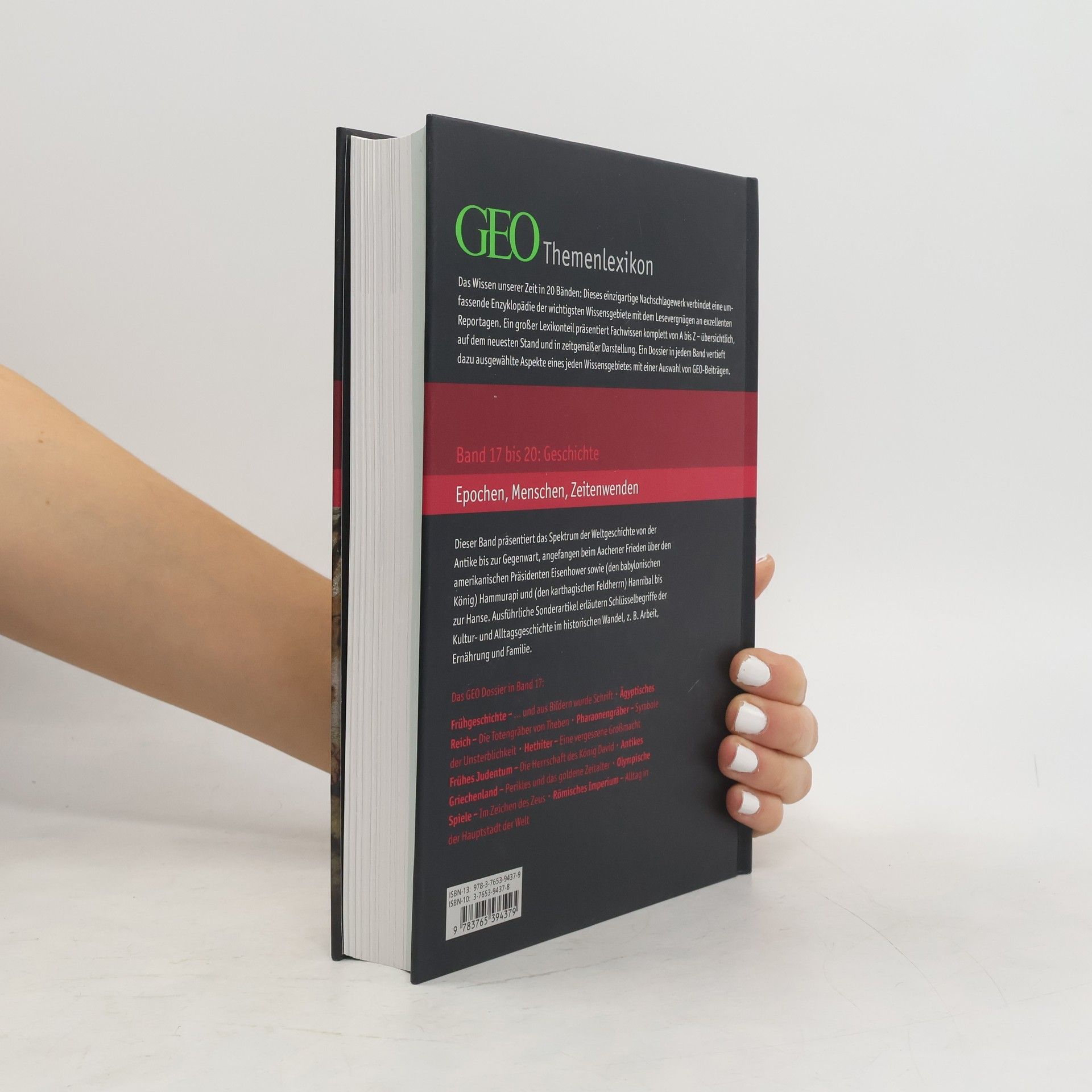 Das Wissen unserer Zeit in 20 Themenbänden: Dieses Nachschlagewerk ist eine Kooperation des Brockhaus-Verlages mit dem Wissenschaftsmagazin GEO und verbindet eine umfassende Enzyklopädie der wichtigsten Wissensgebiete mit dem Lesevergnügen an exzellenten Reportagen im GEO Dossier, das den alphabetischen Stichwortbestand eines jeden Bandes ergänzt. Die Bände 17 bis 20 beschäftigen sich mit dem Themenbereich "Geschichte".