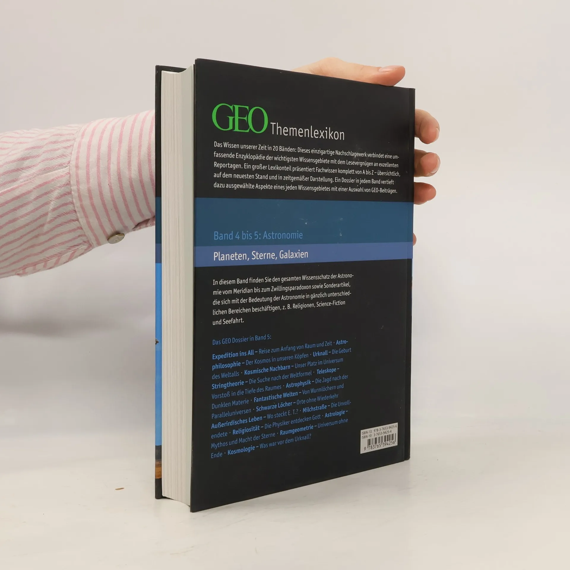 Band 5 Astronomie: Planeten, Sterne, Galaxien Merak bis ZZ-Ceti-Sterne GEO Dossier in diesem Band: Expedition ins All - Reise zum Anfang von Raum und Zeit; Astrophilosophie - Der Kosmos in unseren Köpfen; Urknall - Der Geburt des Weltalls; Kosmische Nachbarn - Unser Platz im Universum; Stringtheorie - Die Suche nach der Weltformel; Teleskope - Vorstoß in die Tiefe des Raumes; Astrophysik - Die Jagd nach der Dunklen Materie; Fantastische Welten - Von Wurmlöchern und Paralleluniversen; Schwarze Löcher - Orte ohne Wiederkehr; Außerirdisches Leben - Wo steckt E.T.?; Milchstraße - Die Unvollendete; Religiosität - Die Physiker entdecken Gott; Astrologie - Mythos und Macht der Sterne; Raumgeometrie - Universum ohne Ende; Kosmologie - Was war vor dem Urknall?