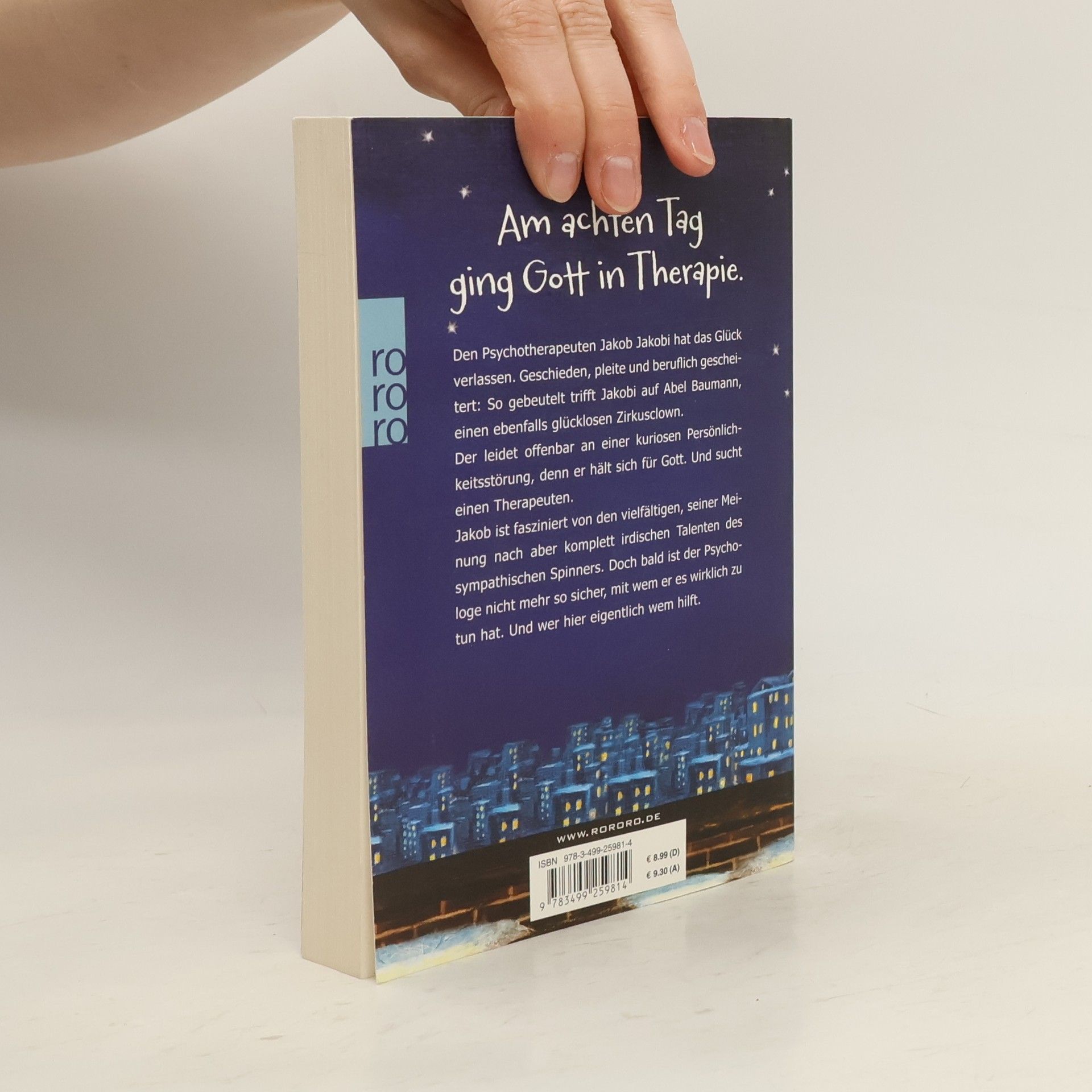 Am achten Tag ging Gott in Therapie Den Psychotherapeuten Jakob Jakobi hat das Glück verlassen. Geschieden, pleite und beruflich gescheitert: So gebeutelt trifft Jakobi auf Abel Baumann, einen ebenfalls glücklosen Zirkusclown.Der leidet offenbar an einer kuriosen Persönlichkeitsstörung, denn er hält sich für Gott. Und sucht einen Therapeuten. Jakob ist fasziniert von den vielfältigen, seiner Meinung nach aber komplett irdischen Talenten des sympathischen Spinners. Doch bald ist der Psychologe nicht mehr so sicher, mit wem er es wirklich zu tun hat. Und wer hier eigentlich wem hilft.