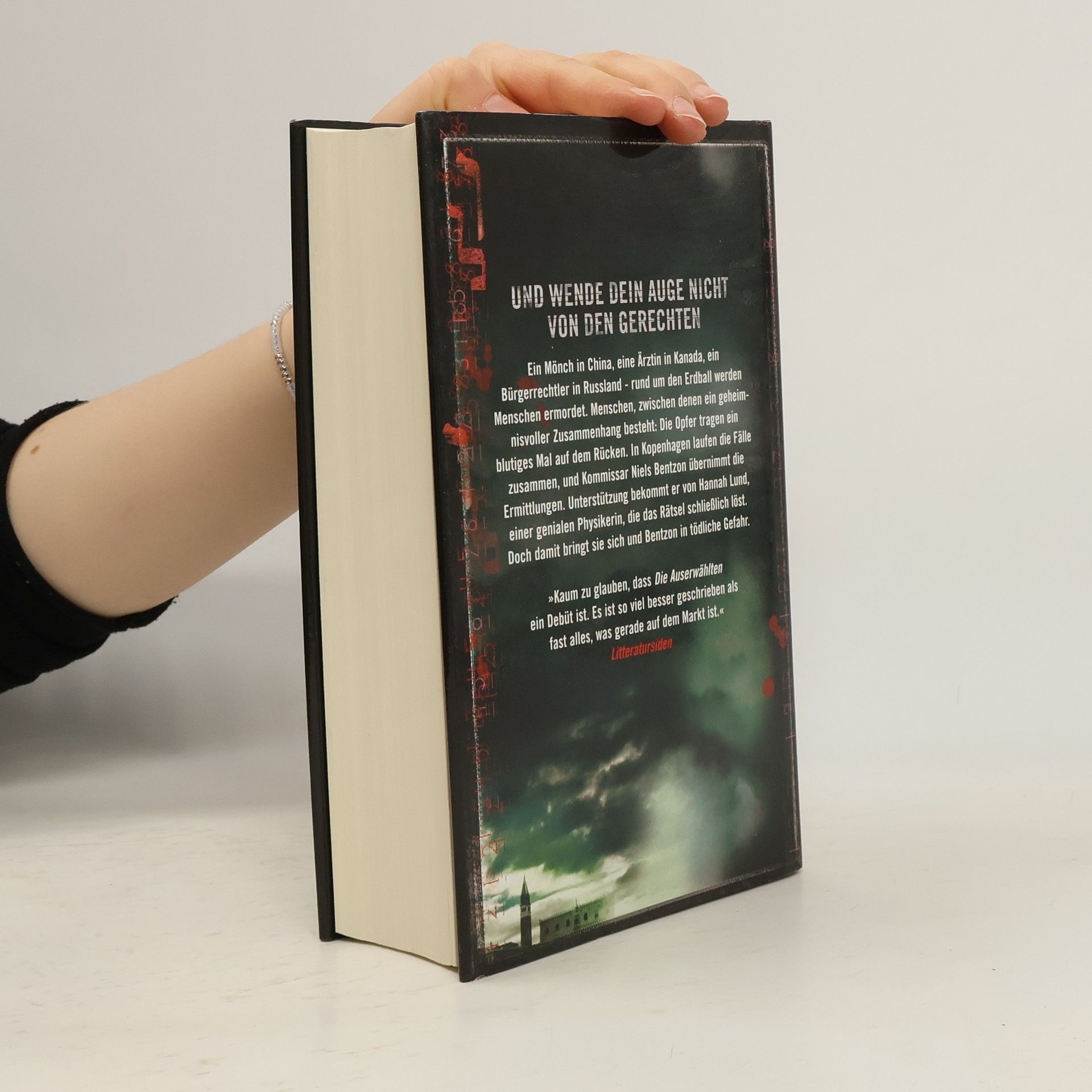 Und wende dein Auge nicht von den Gerechten Kopenhagen, 2009. Die Vorbereitungen auf den Klimagipfel laufen auf Hochtouren, als eine dringende Sicherheitswarnung bei der dänischen Polizei eingeht. Mysteriöse Todesfälle, die im Abstand von sieben Tagen an verschiedenen Orten der Welt gemeldet wurden, geben Anlass zur Sorge. Die Todesursache ist nicht zu ermitteln, doch es scheint eine Verbindung zwischen den Opfern zu geben: Ein seltsames Mal überzieht den Rücken der Toten. Interpol steht vor einem Rätsel, allerdings gibt es einen Hinweis, der nach Dänemark führt. Niels Bentzon, Kommissar bei der Kopenhagener Polizei, wird auf den Fall angesetzt. Ihm zur Seite steht die Physikerin Hannah Lund, die mit mathematischem Sachverstand zu Werke geht. Gemeinsam tragen sie Puzzleteilchen um Puzzleteilchen zusammen. Was sie schließlich zutage fördern, übersteigt zunächst ihre Vorstellungskraft – bis sie gewahr werden, dass es um ihr Leben geht.