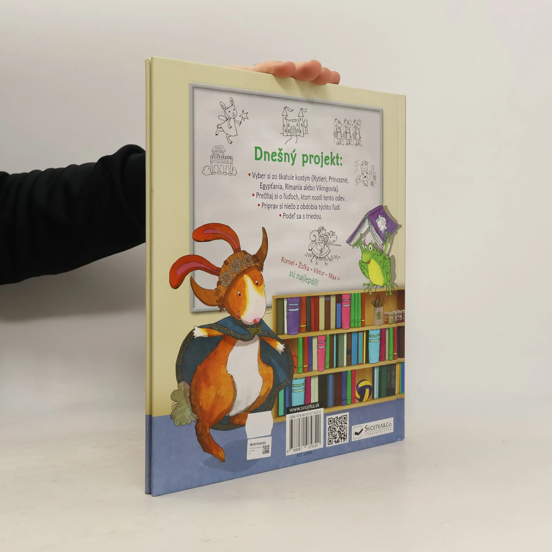 Som králiček Kornel a chodím do školy. Jedného dňa priniesla pani učiteľka škatuľu historických kostýmov. Presvedčí vás tento príbeh, že aj história môže byť zábavná? Jedného dňa prídu králiček Kornel a jeho priatelia Max, Viktor a Žofka do školy a pani učiteľka má pri stole veľkú škatuľu historických kostýmov. Každý z nich si má vybrať jeden, nájsť čo najviac informácií o tom, za koho sa prezlečie, vyrobiť si nejakú vec z toho obdobia a nakoniec svojim spolužiakom o ňom aj porozprávať. Za koho sa králiček a jeho kamaráti prezlečú a o kom vám budú rozprávať? Stanú sa starovekými Egypťanmi, princeznou, rytierom alebo Vikingom? Presvedčí vás tento milý príbeh o tom, že aj história môže byť zábavná?