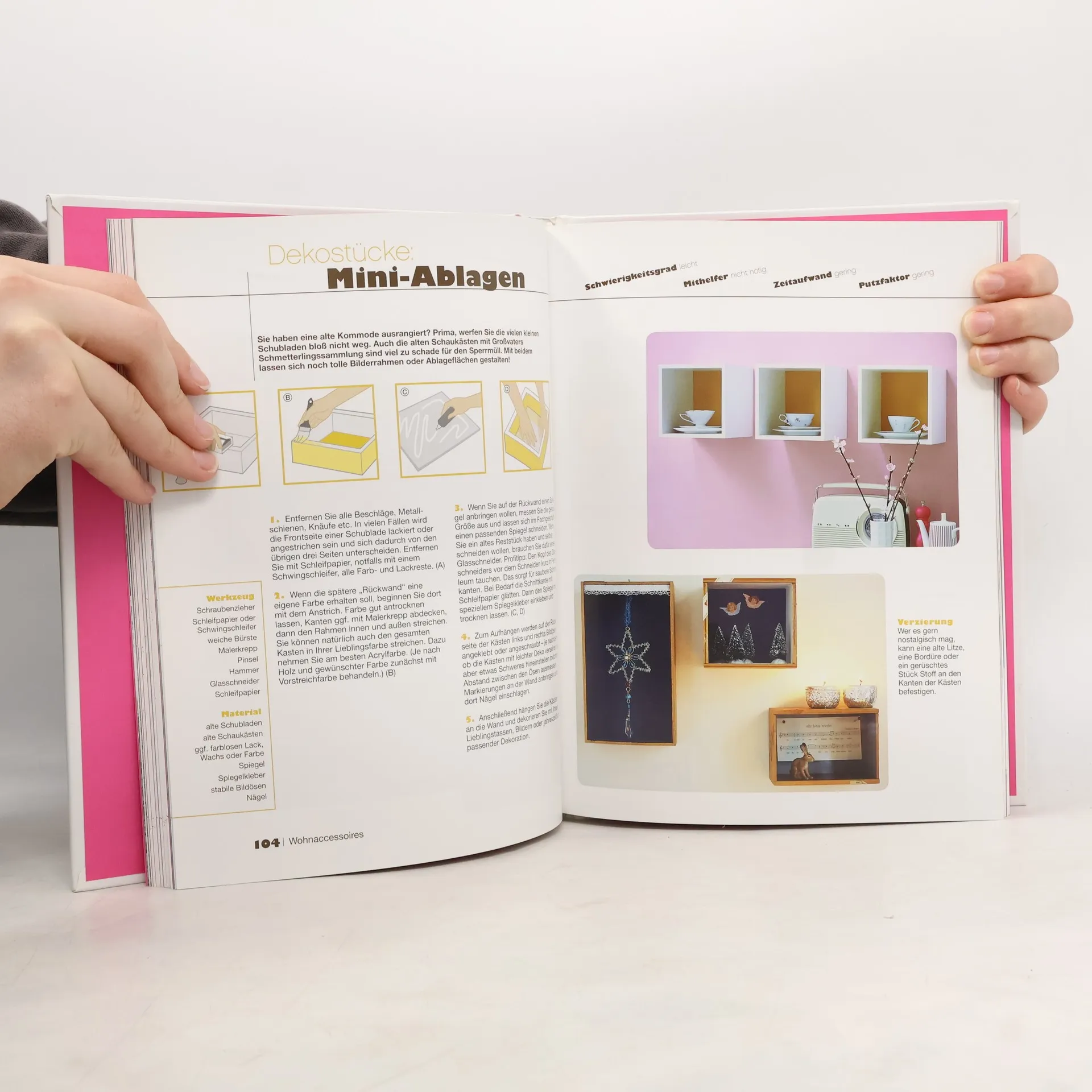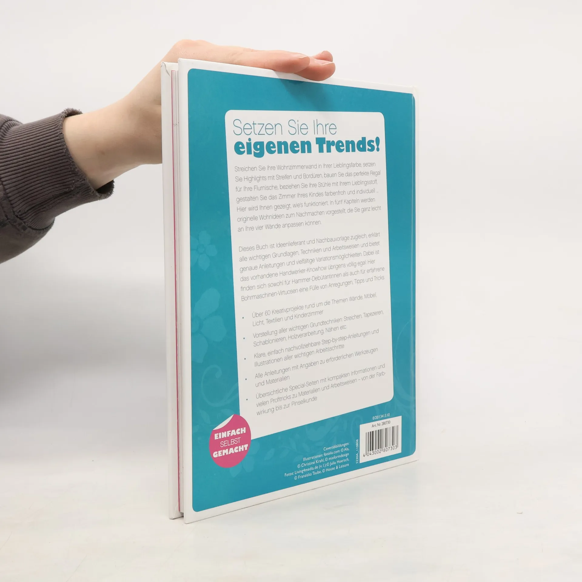 Setzen Sie Ihre eigenen Wohn-Trends! Schöner einrichten und wohnen – mit diesem Buch gestalten Sie Ihre 4 Wände neu und originell. Dieses Buch ist Ideenlieferant und Nachbauvorlage in einem und bietet Ihnen über 60 Kreativprojekte rund um die Themen Wände, Möbel, Licht, Textilien und Kinderzimmer. Jedes Projekt wird mit einer ausführlichen Schritt-für-Schritt-Anleitung, mit Illustrationen zu den einzelnen Arbeitsschritten und Variationsideen vorgestellt. Special-Seiten vermitteln Grundlagentechiken, Werkzeugkunde und Basis-Knowhow zu Materialien, Farben und vielem mehr. - über 60 Kreativprojekte rund um das Thema Einrichten und Wohnen - mit leicht verständlichen Schritt-für-Schritt-Anleitungen, Illustrationen zu wichtigen Arbeitsschritten sowie Angaben zu erforderlichen Werkzeugen und Materialien - Vorstellung aller wichtigen Grundtechniken wie Streichen, Tapezieren, Schablonieren, Holzbearbeitung, Nähen u. v. m.