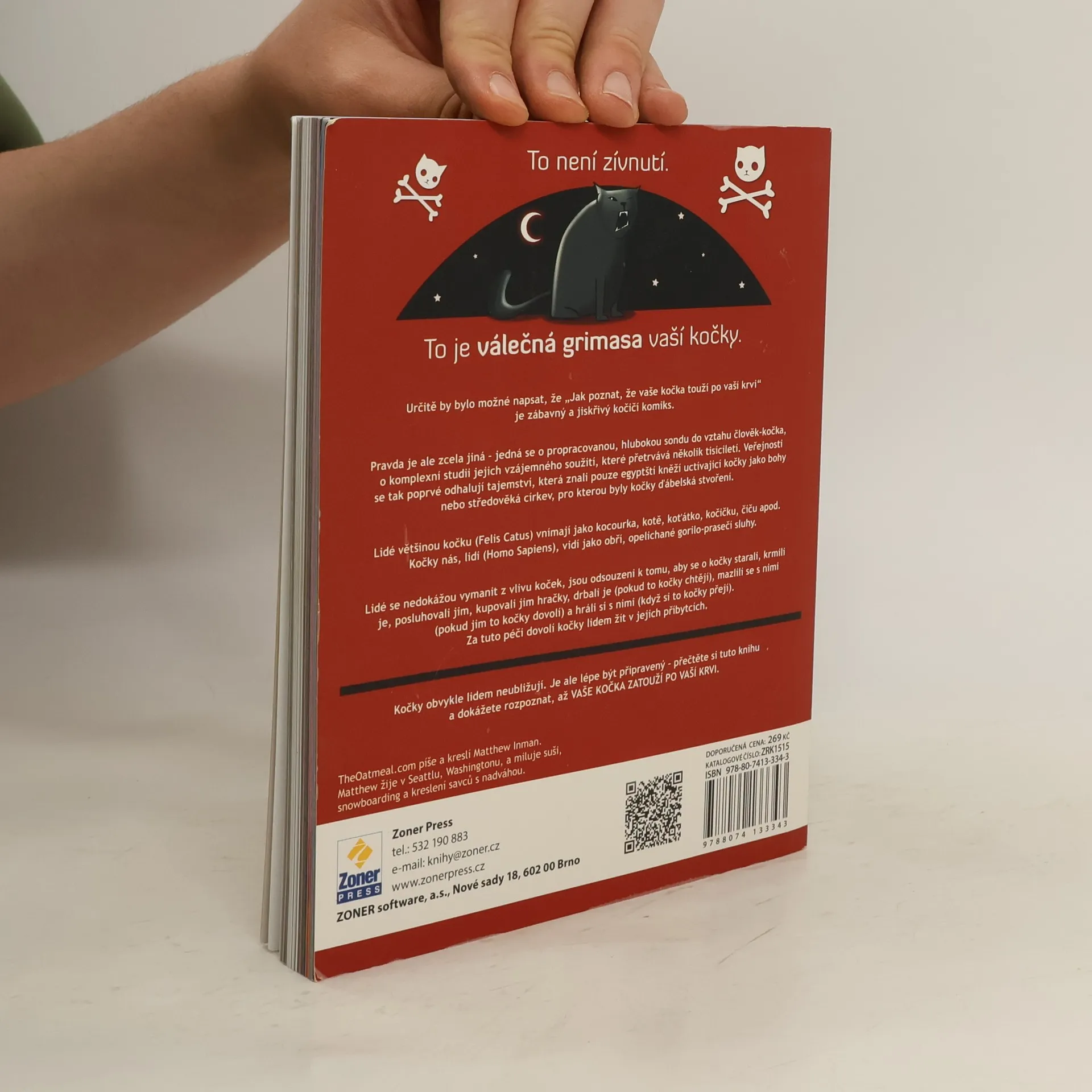 Existuje mnoho knih, které vás naučí, jak se o kočku starat. Je ale jen jediná kniha, která vám řekne, jak poznáte, že vaše kočka touží po vaší krvi. Matthew Inman píše a kreslí pro web The Oatmeal a je autorem řady komiksů, mezi nimiž vyniká jeho kočičí knížka How to tell if your cat is plotting to kill you. Všichni chovatelé a milovníci koček budou souhlasit s tím, že kočky jsou osobnostmi – vyniká to ve srovnání s ostatními domácími mazlíčky včetně psů. Asi i proto jsou kočky námětem tolika skvělých komiksů, stripů nebo kreslených filmů. Knížka prochází celou řadu témat a situací, ve kterých jistě svého vlastního domácího miláčka velmi dobře poznáte. Ať už vezmete kapitolku Jak se mazlit s kotětem nebo třeba (moje oblíbené) Nápady na dárky pro páníčka, jsou to všechno věci odpozorované ze skutečnosti a dotažené do podoby, která vás skvěle pobaví. A co víc – naučíte se rozpoznat okamžik, kdy vaše kočka začne plánovat vaši smrt. To bude nejvyšší čas, kdy byste se měli nad sebou zamyslet, najít chyby, kterých jste se dopustili, a pokusit se ještě všechno zachránit. Třeba bude stačit nějaká hračka, víc mazlení se (pokud bude kočka chtít), nějaká dobrůtka nebo omezit nevhodné chování, když vám chce spát na klíně.