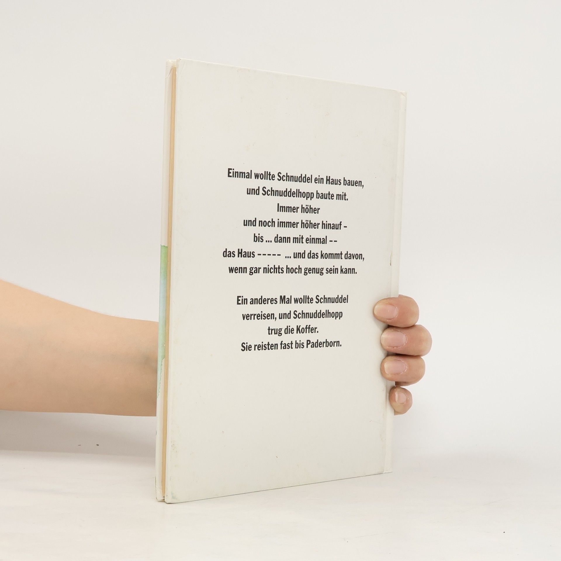 Einmal wollte Schnuddel ein Haus bauen, und Schnuddelhopp baute mit. Immer höher und noch höher hinaus – bis… Dann mit einmal - - das Haus - - - - … und das kommt davon, wenn gar nichts hoch genug sein kann. Ein anderes Mal wollte Schnuddel verreisen, und Schnuddelhopp trug die Koffer. Sie reisten fast bis Paderborn.