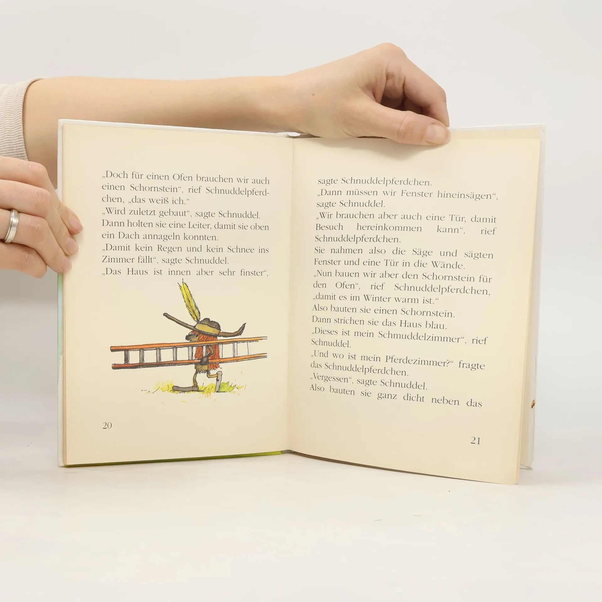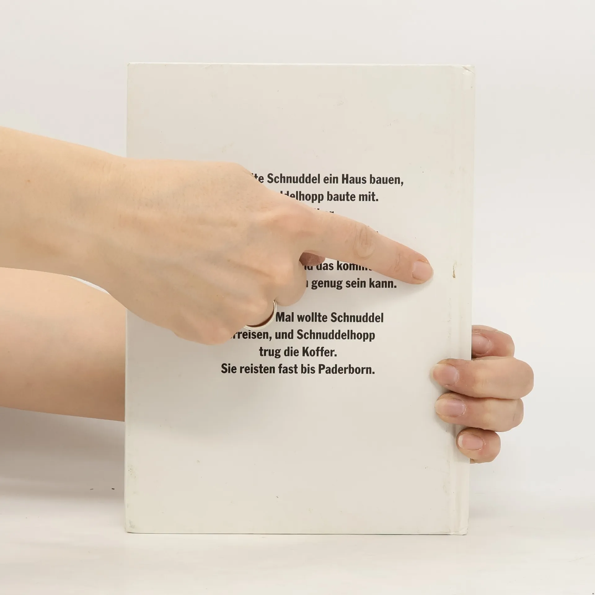 Einmal wollte Schnuddel ein Haus bauen, und Schnuddelhopp baute mit. Immer höher und noch höher hinaus – bis… Dann mit einmal - - das Haus - - - - … und das kommt davon, wenn gar nichts hoch genug sein kann. Ein anderes Mal wollte Schnuddel verreisen, und Schnuddelhopp trug die Koffer. Sie reisten fast bis Paderborn.