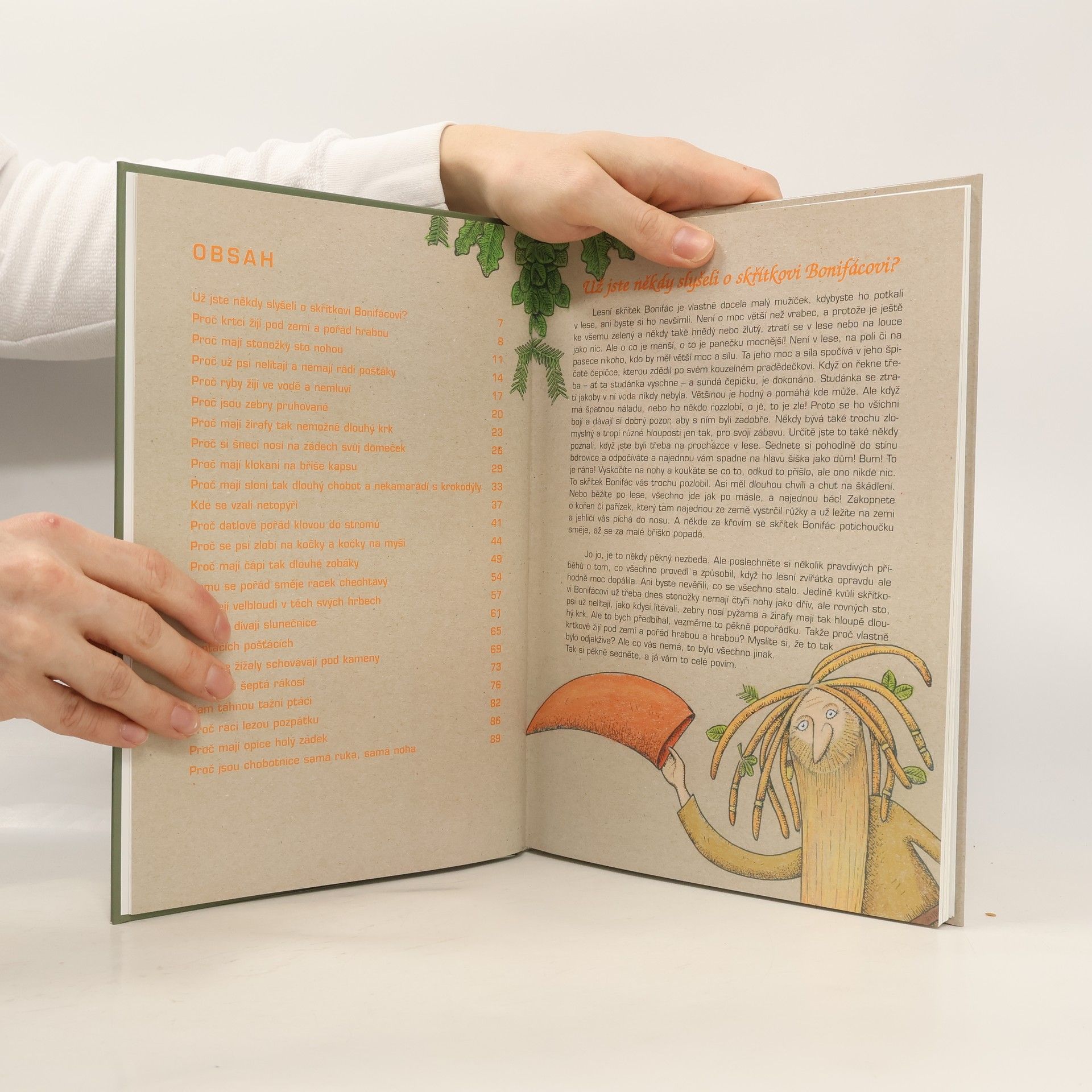 Je to pohádková knížka pro děti od 4 do 8 let o malém lesním skřítkovi s čarovnou čepičkou. Kouzelnou čepičku zdědil po svém praprapradědečkovi a pokud ji Bonifác sundá z hlavy a vyřkne nějaké přání, ihned se splní. Tak se například stalo, že slonům narostly dlouhé nosy, žirafám krk jako tovární komín, stonožkám sto nožiček, krtci teď žijí pod zemí a pořád hrabou, zebry chodí celý den v pyžamu, raci začali lézt pozpátku, klokani dostali na břicho kapsu, psi přestali létat a chodí po zemi a mnoho jiných věcí, o kterých jste jistě nevěděli jak a proč se tak stalo. 24 příběhů o zvířatech a skřítku Bonifácovi, který bdí nad spravedlností mezi zvířaty.