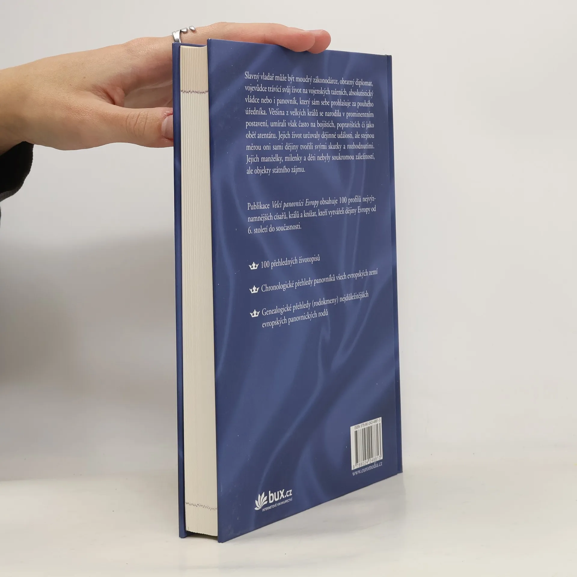 Kniha Velcí panovníci Evropy pojednává o stovce významných vládců, kteří v průběhu patnácti století mezi pádem Říma a naší současností nejvýrazněji utvářeli evropské dějiny – ať již stáli u zrodu nových státních útvarů, vítězili v dobyvačných válkách nebo jen vhodně provdali a oženili své potomky. Pomocí profilů jednotlivých klíčových panovníků publikace mapuje evropské dějiny od Ruska, Bulharska či Osmanské říše až po Švédsko a Velkou Británii. Řazení je chronologické, díky čemuž vynikají vzájemné souvislosti mezi děním v různých zemích. Populárně naučný, avšak faktograficky přesný text doplňují kompletní chronologické přehledy panovníků ve všech evropských zemích a především genealogické přehledy (rodokmeny) nejdůležitějších evropských panovnických rodů.