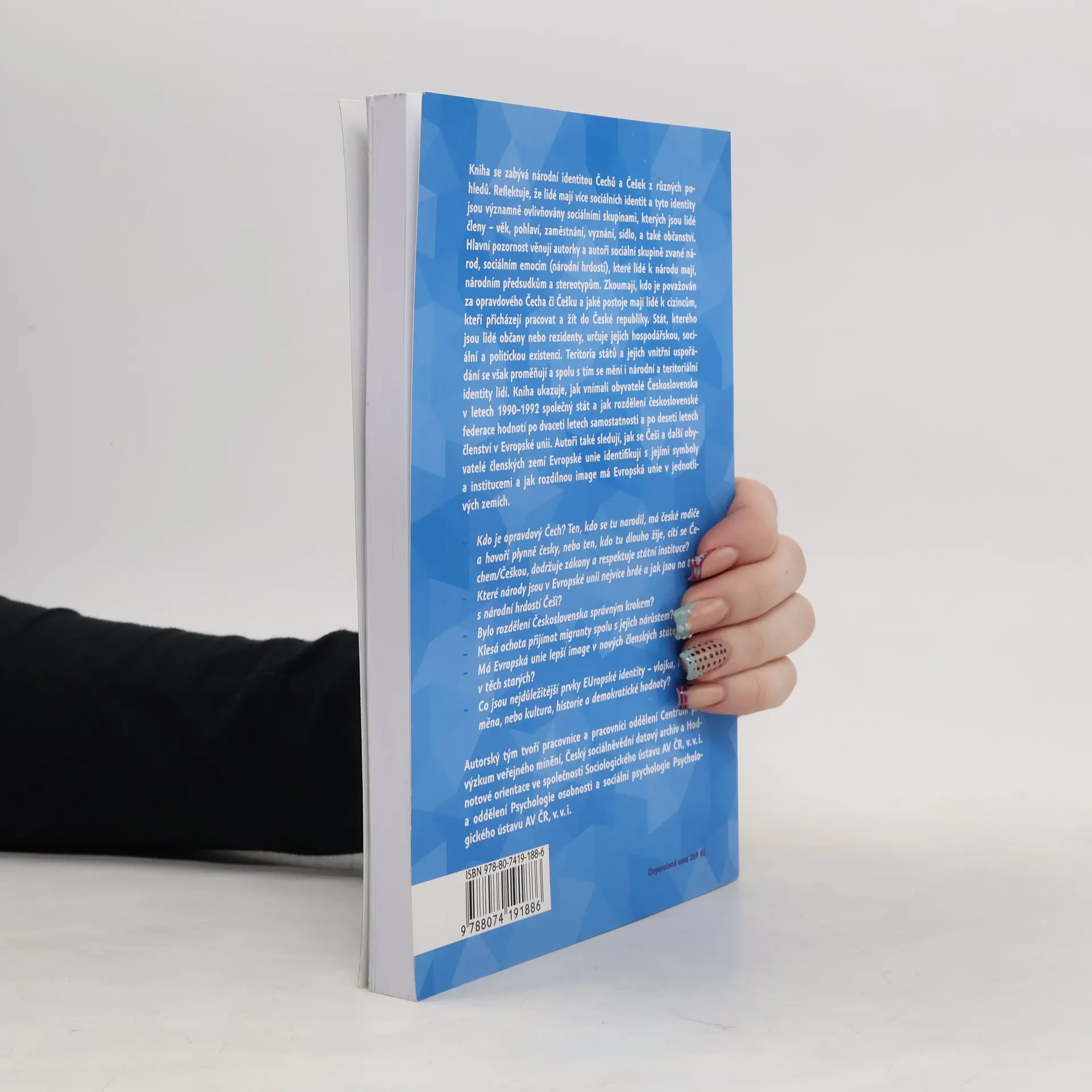 Kniha se zaměřuje na národní identitu Čechů a Češek z různých perspektiv. Lidé mají mnoho sociálních identit, závislých na skupinách, jichž jsou členy. Hlavní důraz je kladen na národ jako sociální skupinu, národní hrdost, předsudky a stereotypy. Autoři zkoumali, kdo je považován za pravého Čecha či Češku a jaké postoje mají lidé k cizincům, kteří přicházejí do České republiky. Občanství ovlivňuje hospodářskou, sociální a politickou existenci jednotlivců, přičemž se mění i národní a teritoriální identity. Kniha zkoumá, jak vnímali obyvatelé Československa v letech 1990–1992 společný stát a jak se identifikují lidé v 28 členských státech EU s touto nadnárodní entitou. Zajímá nás, zda je občanství v každodenním životě důležité, nebo zda hrají větší roli zaměstnání, rodinný stav a věk. Stereotyp Čecha s nízkou národní identifikací je negativní. Jak nás vidí sousední národy? Bylo rozdělení Československa správné? Kdo je opravdový Čech? Je to ten, kdo se narodil v Česku, nebo ten, kdo zde dlouho žije a ctí zákony? Jak se mění ochota přijímat migranty s jejich rostoucím počtem? Jaký je obraz EU v nových a starých členských státech? Jaké prvky evropské identity jsou nejdůležitější? A jak si Češi stojí v otázce národní hrdosti?