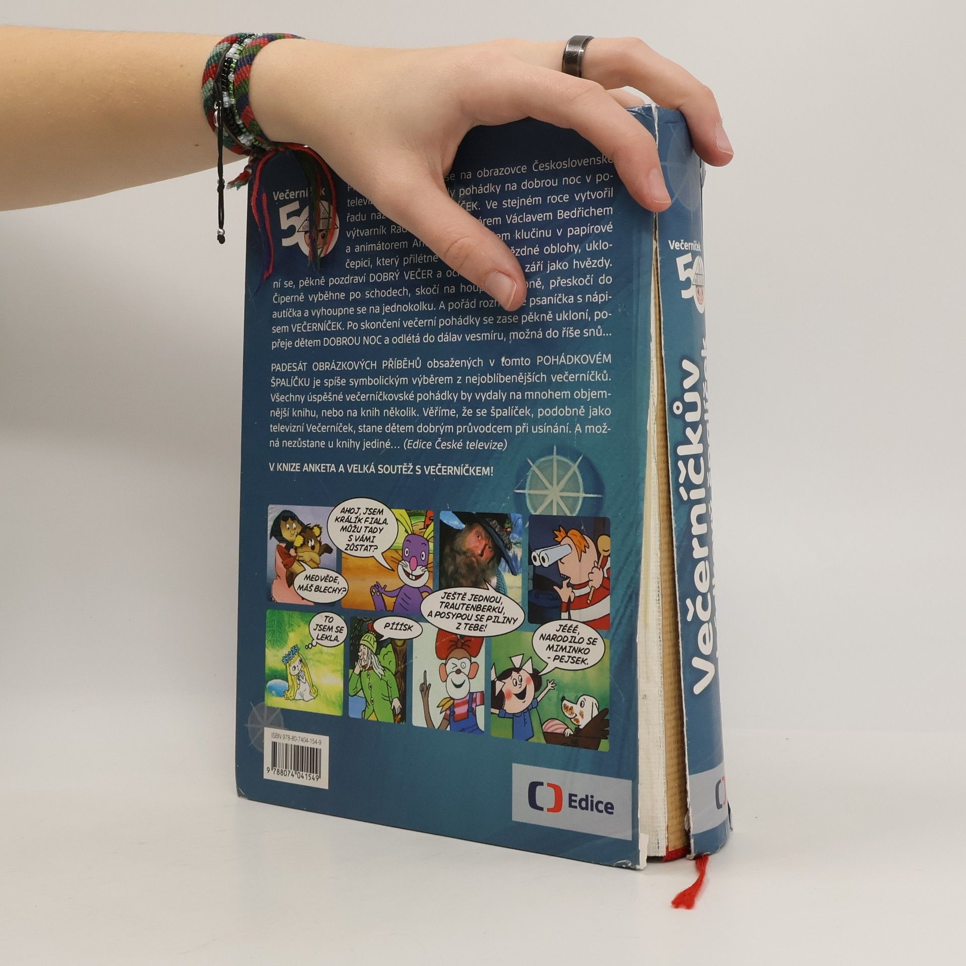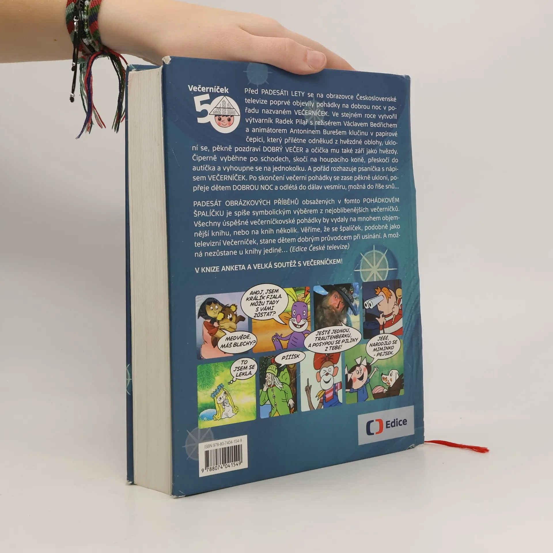 50 let Večerníčku - 50 obrázkových příběhů V knize anketa a velká soutěž s Večerníčkem! Před PADESÁTI LETY se na obrazovce Československé televize poprvé objevily pohádky na dobrou noc v pořadu nazvaném VEČERNÍČEK. Ve stejném roce se k pořadu přidal klučina v papírové čepici, který přilétne odněkud z hvězdné oblohy, ukloní se, mile pozdraví DOBRÝ VEČER a očička mu také září jako hvězdy. Čiperně vyběhne po schodech, skočí na houpacího koně, přeskočí do autíčka a vyhoupne se na jednokolku. A pořád rozhazuje psaníčka s nápisem VEČERNÍČEK. Po skončení večerní pohádky se zase pěkně ukloní, popřeje dětem DOBROU NOC a odlétá do dálav vesmíru, možná do říše snů... PADESÁT OBRÁZKOVÝCH PŘÍBĚHŮ obsažených v tomto POHÁDKOVÉM ŠPALÍČKU je spíše symbolickým výběrem z nejoblíbenějších večerníčků. Všechny úspěšné večerníčkovské pohádky by vydaly na mnohem objemnější knihu, nebo na knih několik. Prozatím ale postačí, když se tento svazek pohádek, podobně jako televizní Večerníček, stane dětem dobrým průvodcem při usínání. V KNIZE ANKETA A VELKÁ SOUTĚŽ S VEČERNÍČKEM!