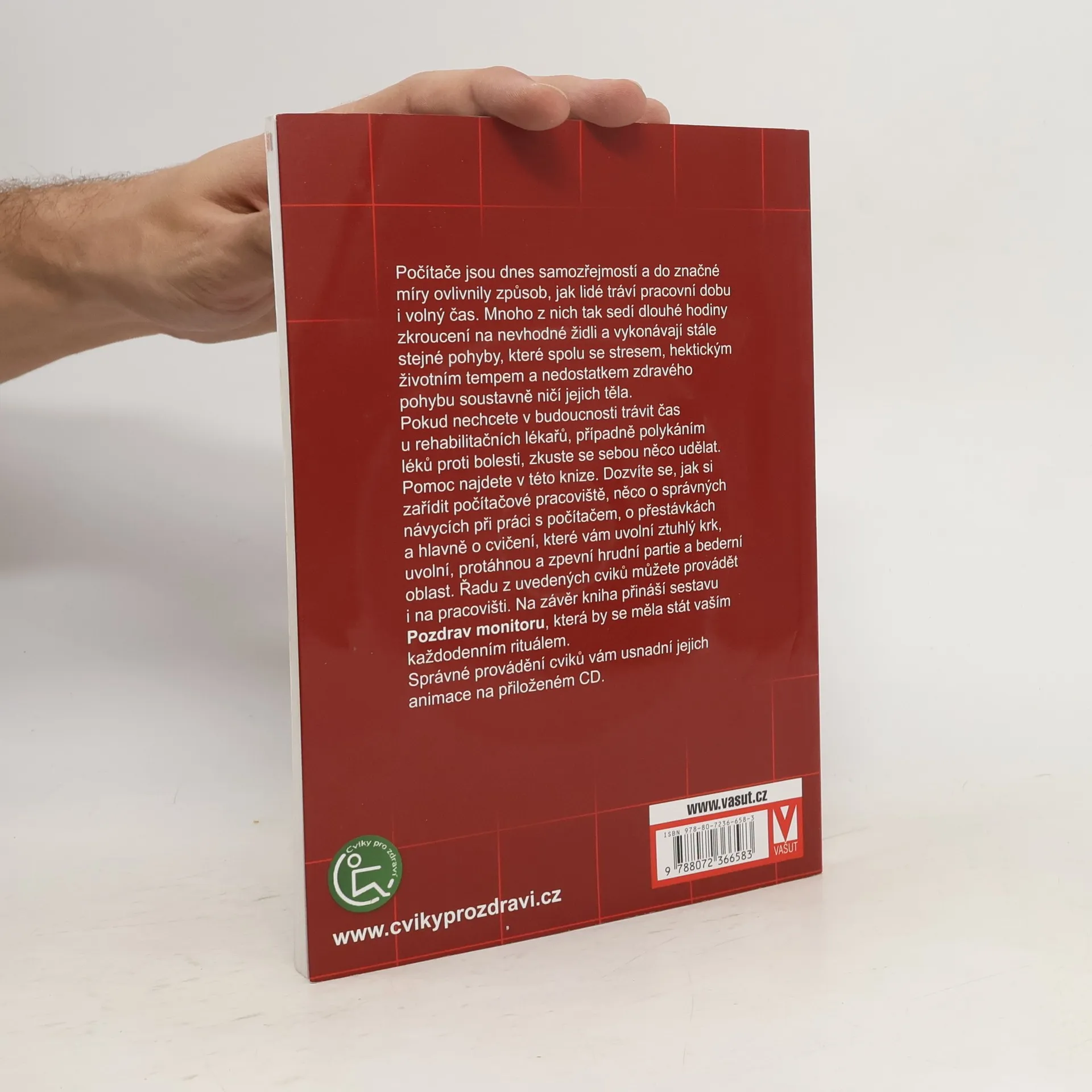 Počítače jsou dnes samozřejmostí a do značné míry ovlivnily způsob, jak lidé tráví pracovní dobu i volný čas. Mnoho z nich tak sedí dlouhé hodiny zkroucení na nevhodné židli a vykonávají stále stejné pohyby, které spolu se stresem, hektickým životním tempem a nedostatkem zdravého pohybu soustavně ničí jejich těla. Pokud nechcete v budoucnosti trávit čas u rehabilitačních lékařů, případně polykáním léků proti bolesti, zkuste se sebou něco udělat. Pomoc najdete v této knize. Dozvíte se, jak si zařídit počítačové pracoviště, něco o správných návycích při práci s počítačem, o přestávkách a hlavně o cvičení, které vám uvolní ztuhlý krk, uvolní, protáhnou a zpevní hrudní partie a bederní oblast. Řadu uvedených cviků můžete provádět i na pracovišti. Na závěr kniha přináší sestavu POZDRAV MONITORU, která by se měla stát vaším každodenním rituálem.