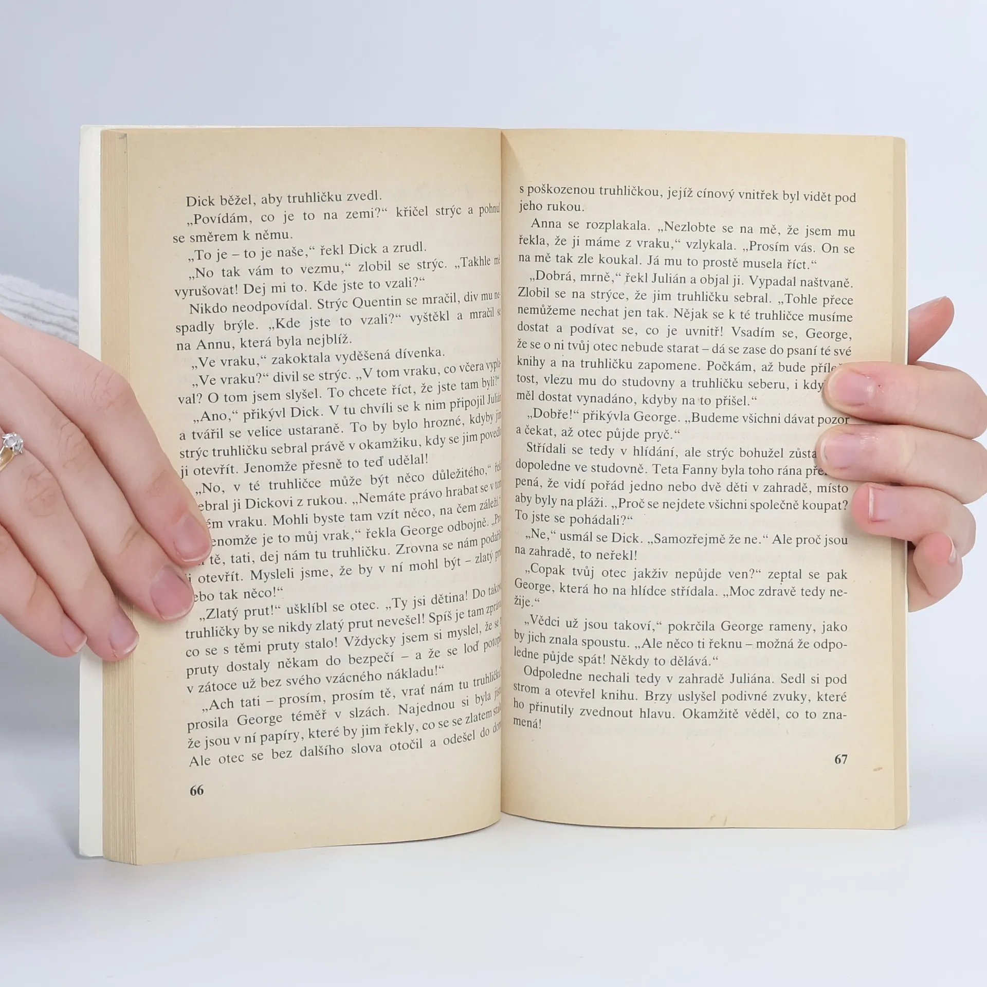 Správná pětka, to jsou ve skutečnosti čtyři a pes! Julián, Dick, George, Anna a pes Tim.Taky byste si přáli mít vlastní ostrov, který by byl jen a jen váš? A zažít takové dobrodružství jako správná pětka? Plavili byste se po moři, přespávali v bouři ve zřícenině starého hradu a prozkoumali potopený vrak! A jak má takové správné dobrodružství skončit? Přece honbou za pokladem!