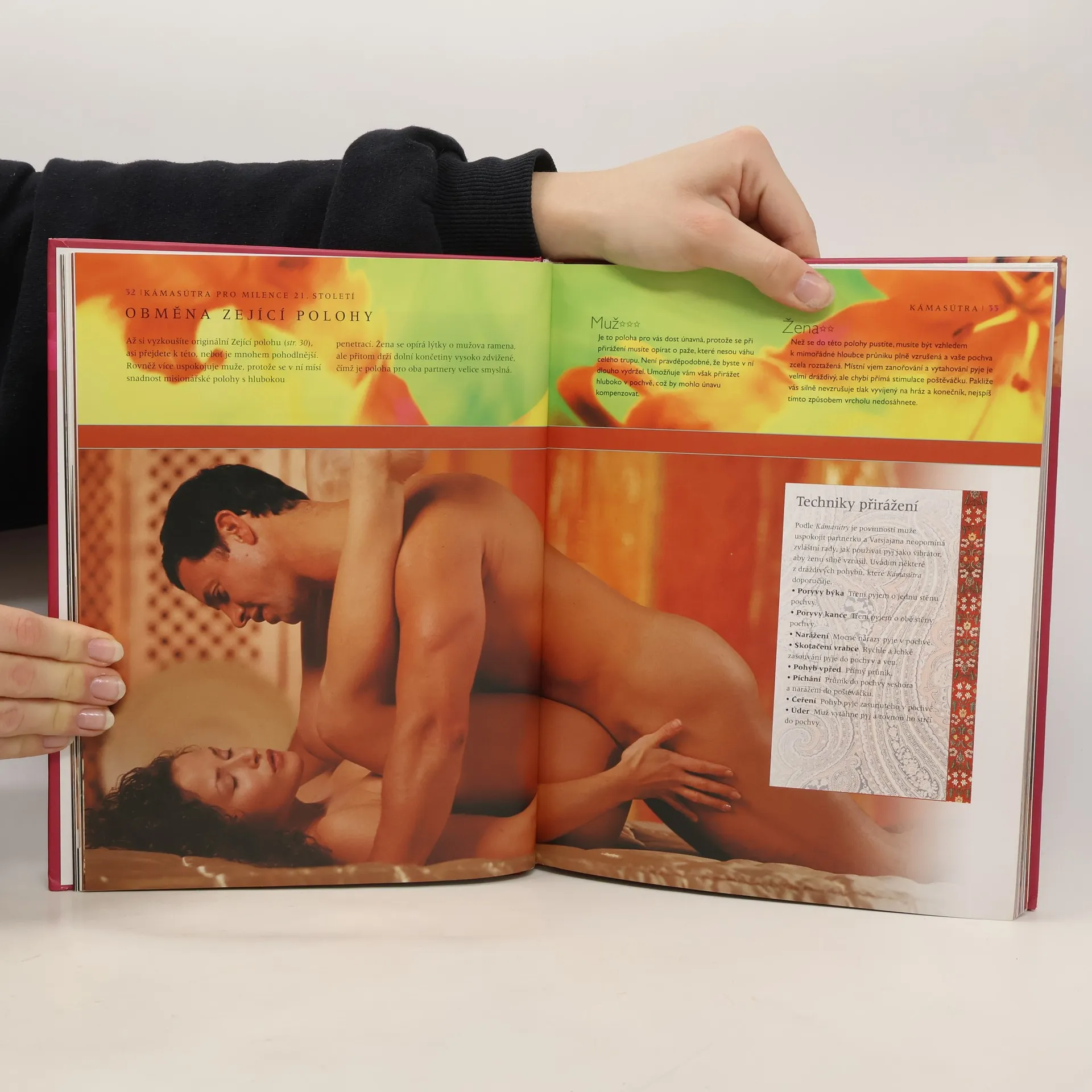 Klasické techniky pro současné milence. Exotický koktejl starověké a současné moudrosti, namíchaný z více než stovky milostných poloh, jež mají přinést vrcholné uspokojení, je bohatou inspirací, s níž do sexuálního života vnesete kouzlo Orientu. Světoznámá sexuoložka aktualizovala mistrovská díla erotické literatury - Kámasútra, Vonná zahrada, Ananga Ranga a Tao. Provádí čtenáře záludnostmi jednotlivých pozic a radí, které polohy prohloubí sexuální vnímání u muže a ženy. Propojení starobylé východní erotiky s luxusními fotografiemi je doplněno nic nezastírajícími instrukcemi a moderními sexuologickými radami.