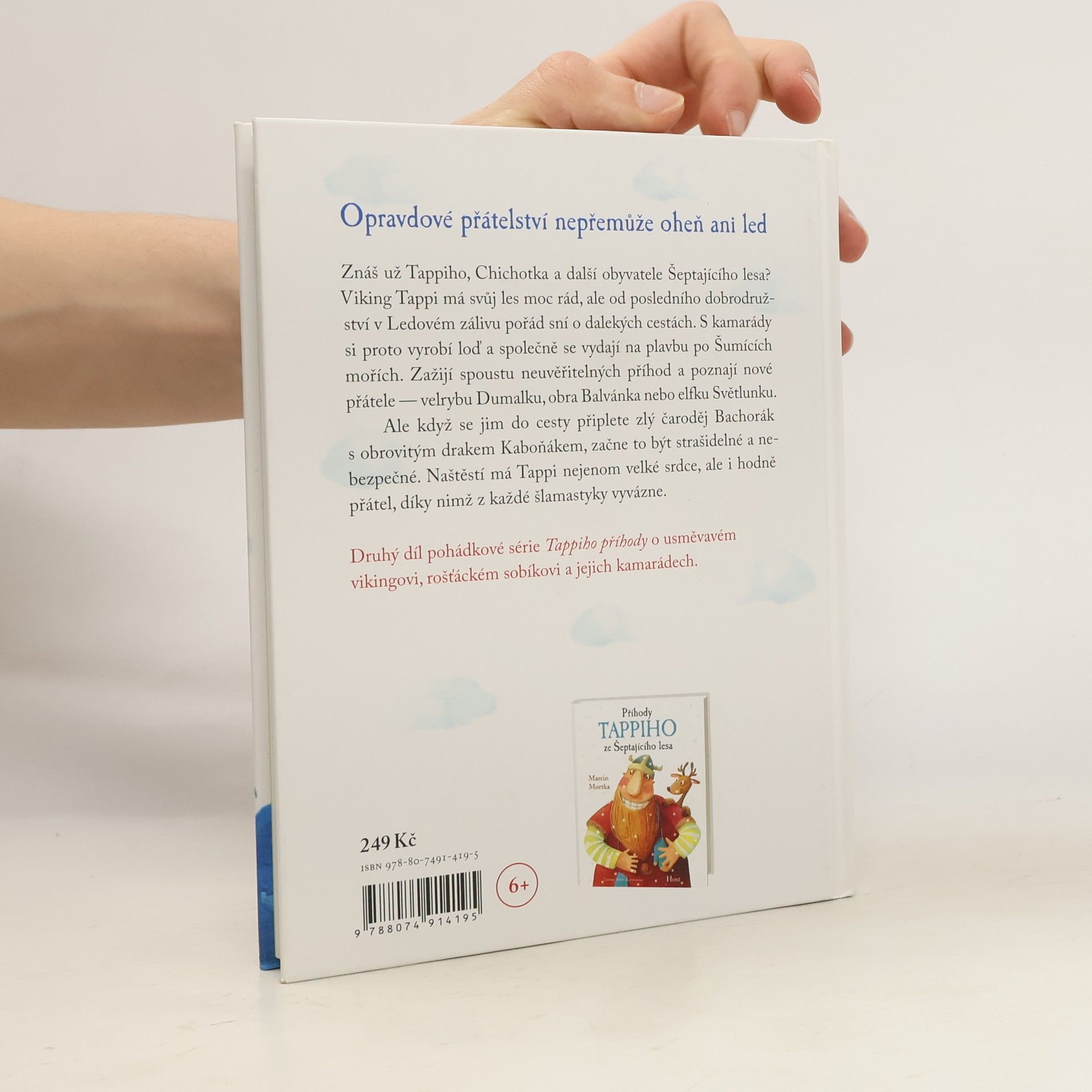 Druhý díl série o usměvavém vikingovi a jeho kamarádech. Jestlipak už znáš Tappiho, Chichotka a další obyvatele Šeptajícího lesa? Viking Tappi má tenhle les moc rád, ale od posledního dobrodružství v Ledovém zálivu pořád sní o dalekých cestách. S kamarády si proto vyrobí loď a společně se vydají na plavbu po Šumících mořích. Na moři se jim přihodí spousta neuvěřitelných příhod a také poznají nové přátele — například velrybu Dumalku, obra Balvánka anebo elfku Světlunku. Ale když se jim do cesty připlete zlý čaroděj Bachorák s obrovitým drakem Kaboňákem, začne to být strašidelné a nebezpečné. Naštěstí má Tappi nejenom velké srdce, ale také hodně kamarádů, díky kterým z každé šlamastyky vyvázne celý. Marcin Mortka vytvořil kouzelný svět plný zvířátek, zvláštních bytostí a zábavných situací. Postavy prožívají spoustu úžasných dobrodružství, která děti učí, co je v životě nejdůležitější. Dobrosrdečného vikinga Tappiho, který pomáhá druhým, pečuje o své přátele a chrání je před každým, kdo by jim chtěl ublížit, si prostě zamiluje celá rodina. Pro čtenáře od šesti let.