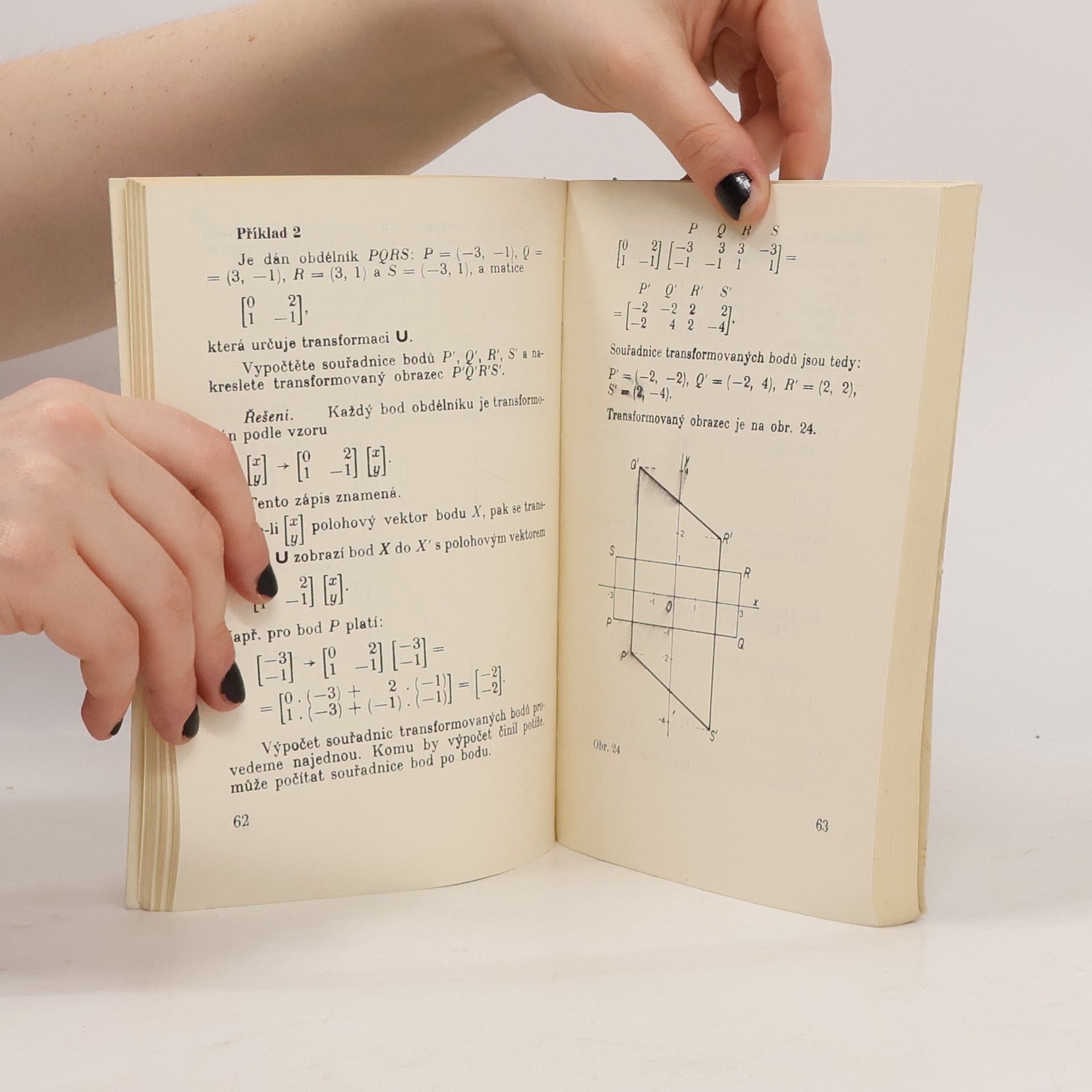 Vysvětluje, co je matice, použití matic k popsání různých situací, sčítání matic, násobení matice číslem a násobení dvou matic. V samostatných kapitolách se zabývá geometrickými transformacemi pomocí matic, algebrou matic adalším užitím matic. Výklad je doplněn příklady, jejichž výsledky jsou uvedeny na konci knížky.