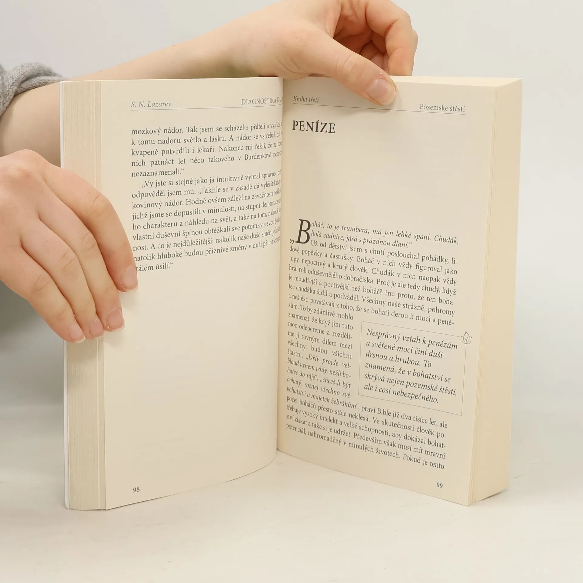 3.ti kniha z řády Diagnostika karmy. Ve skutečnosti člověk potřebuje vysoký intelekt a velké schopnosti, aby dokázal bohatství získat a také si je udržet. Především však musí mít mravní potenciál, nahromaděný v minulých životech. Pokud je tento potenciál nízký, bohatství jej nerozvíjí, ale kazí. Nesprávný vztah k penězům a svěřené moci činí duši drsnou a hrubou. To znamená, že v bohatství se skrývá nejen pozemské štěstí, ale i cosi nebezpečného. Nemoc je lékem pro duši. Láska je také lékem pro duši a člověk si vybere sám, zda chce lék hořký, nebo sladký.