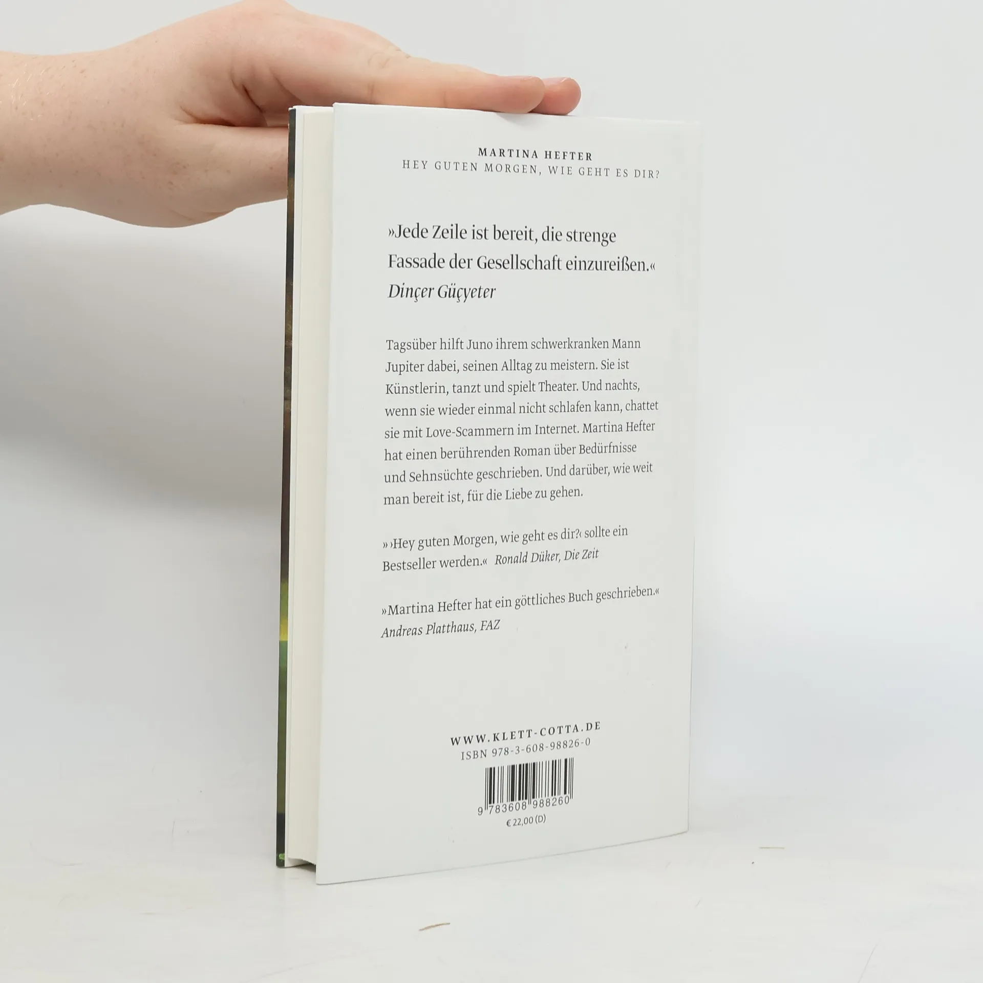 Tagsüber hilft Juno ihrem schwerkranken Mann Jupiter dabei, seinen Alltag zu meistern. Außerdem ist sie Künstlerin, tanzt und spielt Theater. Und nachts, wenn sie wieder einmal nicht schlafen kann, chattet sie mit Love-Scammern im Internet. Martina Hefter hat einen berührenden Roman über Bedürfnisse und Sehnsüchte im Leben geschrieben. Und darüber, wie weit man bereit ist, für die Liebe zu gehen.Juno schreibt online mit Männern, die Frauen online ihre Liebe gestehen und so versuchen, sie um ihr Geld zu bringen. Doch statt darauf hereinzufallen, werden genau diese Männer zu einer Form von Freiheit für Juno. In den Gesprächen kann sie sein, wer sie will und sagen, was sie will – und das vermeintlich ohne Konsequenzen. Ganz im Gegensatz zu ihrem sonstigen Leben, in dem sie immer unterwegs, immer besorgt um Jupiter, immer beschäftigt und eingebunden ist. Also flüchtet Juno ab und zu vor ihrem Alltag ins Internet und spielt dort Spielchen mit Männern, die sie anlügen. Sie selbst wird zur Lügnerin. Aber ist es nicht so, dass man sich beim Lügen zuallererst selbst belügt? Eines Tages trifft Juno auf Benu, der ihre Behauptungen ebenso durchschaut wie sie seine. Und trotz der Entfernung zwischen ihnen entsteht eine Verbindung. »Hey guten Morgen, wie geht es dir« ist ein tiefgehender Roman, aber so leichtfüßig wie eine Komödie.