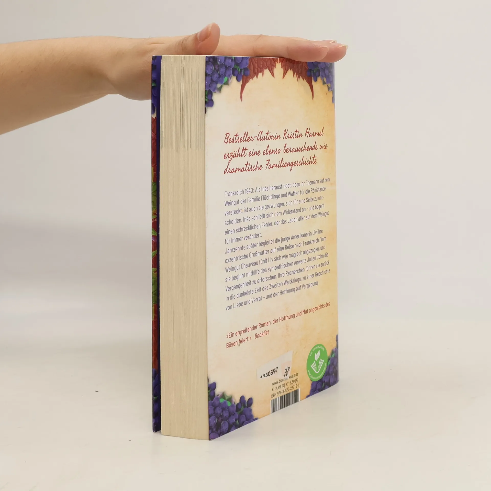 Eine grausame Zeit, ein schrecklicher Fehler und die Hoffnung auf Vergebung: Die Geschichte spielt in Frankreich während des Zweiten Weltkriegs. 1940 entdeckt Inés, dass ihr Ehemann auf dem Familienweingut Flüchtlinge und Waffen für die Résistance versteckt. Sie entscheidet sich, dem Widerstand beizutreten, begeht jedoch einen folgenschweren Fehler, der das Leben aller auf dem Weingut für immer verändert. Jahrzehnte später reist die junge Amerikanerin Liv mit ihrer exzentrischen Großmutter nach Frankreich. Sie fühlt sich magisch zum Weingut Chauveau hingezogen und spürt, dass ihre Großmutter einen besonderen Grund für die Reise hat. Unterstützt von dem sympathischen Anwalt Julien Cohn beginnt Liv, die Geschichte des Weinguts zu erforschen. Ihre Nachforschungen führen sie zurück in die dunkelsten Zeiten des Krieges, in eine Erzählung von Liebe und Verrat sowie der Hoffnung auf Vergebung. Diese tragische und wunderschöne Familien- und Liebesgeschichte verbindet sich nahtlos mit den Themen von Harmels vorherigem Erfolg und wird alle begeistern, die große historische Romane über das 20. Jahrhundert schätzen.