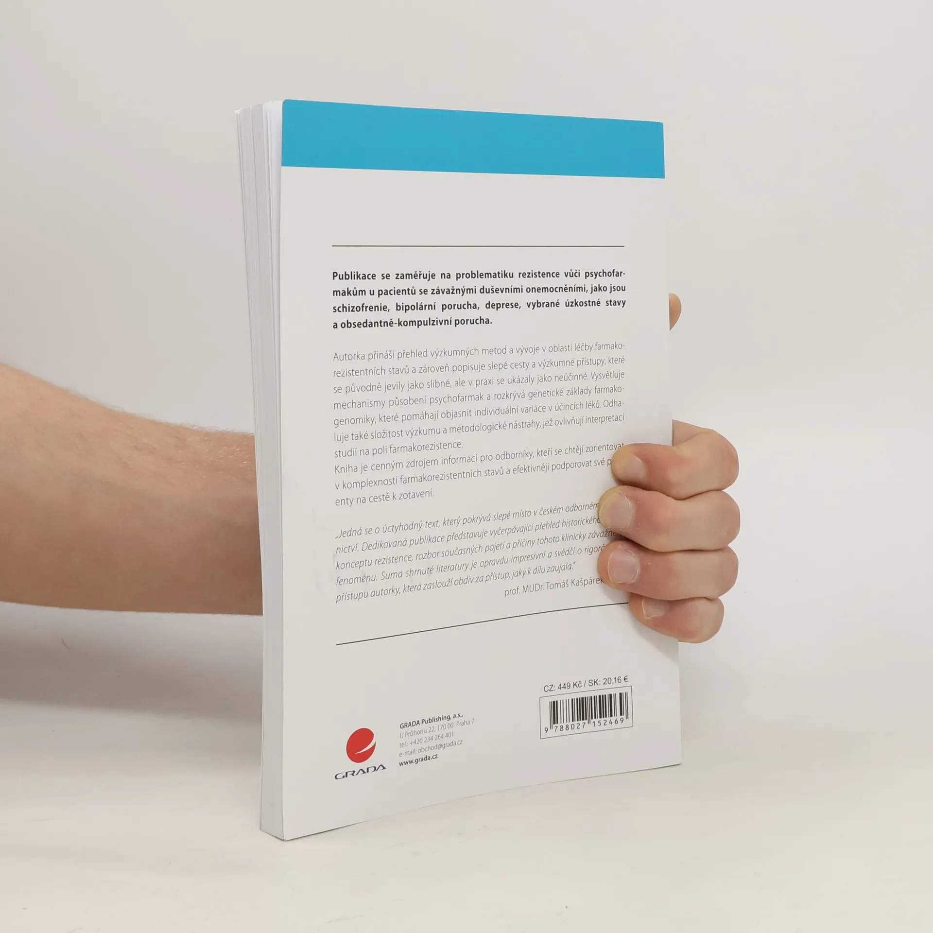 Publikace se zaměřuje na problematiku rezistence vůči psychofarmakům u pacientů se závažnými duševními onemocněními, jako jsou schizofrenie, bipolární porucha, deprese, vybrané úzkostné stavy a obsedantně-kompulzivní porucha. Autorka přináší přehled výzkumných metod a vývoje v oblastiléčby farmakorezistentních stavů a zároveň popisuje slepé cesty a výzkumné přístupy, které se původně jevily jako slibné, ale v praxi se ukázaly jako neúčinné. Vysvětluje mechanismy působení psychofarmak a rozkrývá genetické základy farmakogenomiky, které pomáhají objasnit individuální variace v účincích léků. Odhaluje také složitost výzkumu a metodologické nástrahy, jež ovlivňují interpretaci studií na poli farmakorezistence. Kniha je cenným zdrojem informací pro odborníky, kteří se chtějí zorientovat v komplexnosti farmakorezistentních stavů a efektivněji podporovat své pacienty na cestě k zotavení.