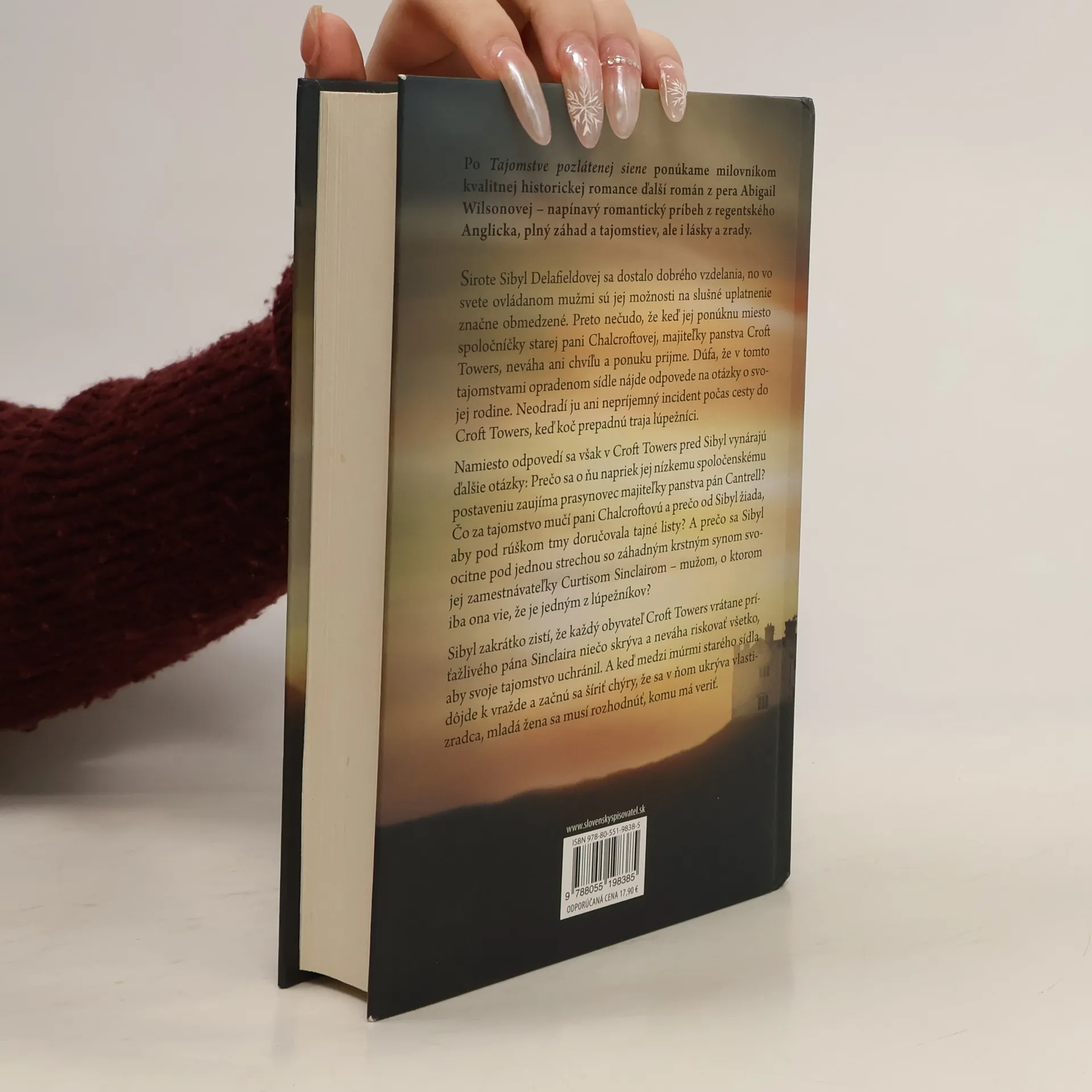Po Tajomstve pozlátenej siene ponúkame milovníkom kvalitnej historickej romance ďalší román z pera Abigail Wilsonovej – napínavý romantický príbeh z regentského Anglicka, plný záhad a tajomstiev, ale i lásky a zrady. Sirote Sibyl Delafieldovej sa dostalo dobrého vzdelania, no vo svete ovládanom mužmi sú jej možnosti na slušné uplatnenie značne obmedzené. Preto nečudo, že keď jej ponúknu miesto spoločníčky starej pani Chalcroftovej, majiteľky panstva Croft Towers, neváha ani chvíľu a ponuku prijme. Dúfa, že v tomto tajomstvami opradenom sídle nájde odpovede na otázky o svojej rodine. Neodradí ju ani nepríjemný incident počas cesty do Croft Towers, keď koč prepadnú traja lúpežníci. Namiesto odpovedí sa však v Croft Towers pred Sibyl vynárajú ďalšie otázky: Prečo sa o ňu napriek jej nízkemu spoločenskému postaveniu zaujíma prasynovec majiteľky panstva pán Cantrell? Čo za tajomstvo mučí pani Chalcroftovú a prečo od Sibyl žiada, aby pod rúškom tmy doručovala tajné listy? A prečo sa Sibyl ocitne pod jednou strechou so záhadným krstným synom svojej zamestnávateľky Curtisom Sinclairom - mužom, o ktorom iba ona vie, že je jedným z lúpežníkov? Sibyl zakrátko zistí, že každý obyvateľ Croft Towers vrátane príťažlivého pána Sinclaira niečo skrýva a neváha riskovať všetko, aby svoje tajomstvo uchránil. A keď medzi múrmi starého sídla dôjde k vražde a začnú sa šíriť chýry, že sa v ňom ukrýva vlastizradca, mladá žena sa musí rozhodnúť, komu má veriť, a zároveň sa pokúsiť odhaliť pravdu o vlastnej minulosti.
