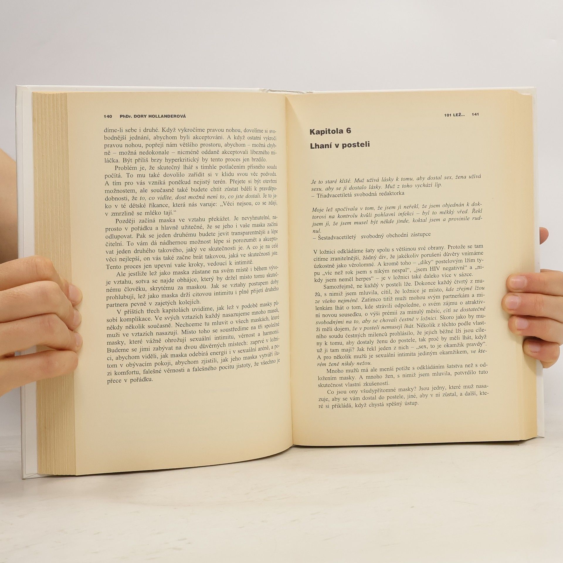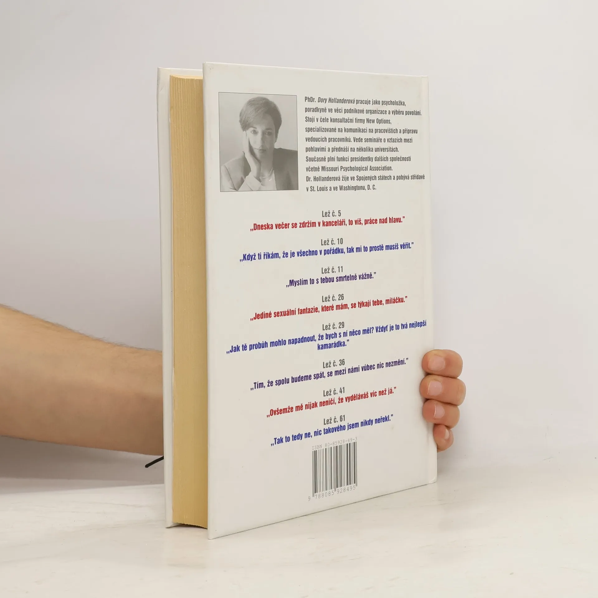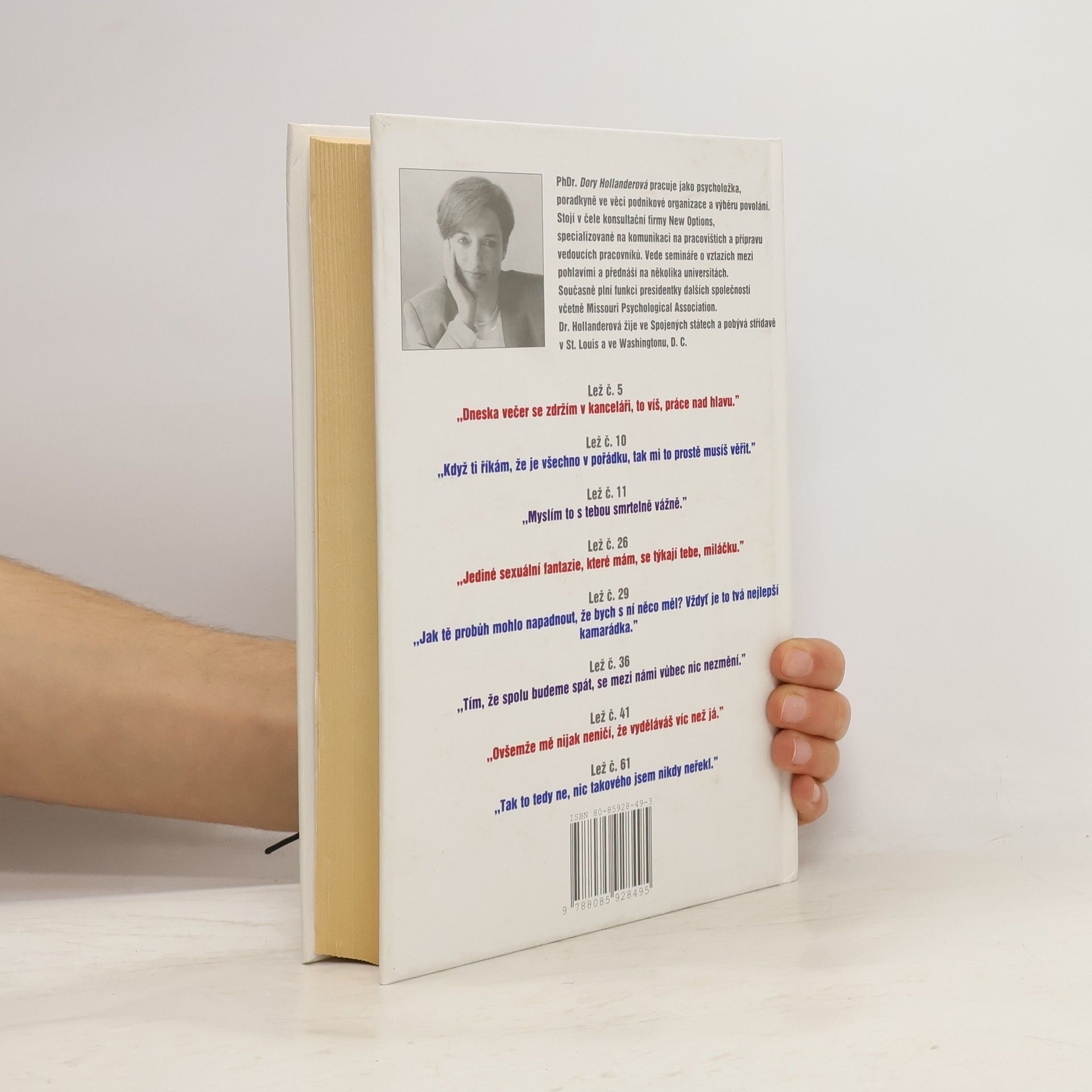 101 lež kterou muži říkají ženám - a proč jim ženy věří. PhDr. D.Hollanderová pracuje jako psycholožka, poradkyně ve věci podnikové organizace a výběru povolání. Vede semináře o vztazích mezi pohlavími a přednáší na několika univerzitách. Několik příkladů z knihy: Lež č.5. Dneska se zdržím v kanceláři, to víš, práce nad hlavu. Lež č.10. Když ti říkám, že je vše v pořádku, tak mi to prostě musíš věřit. Lež č.11. Myslím to s tebou smrtelně vážně. Lež č.26. Jediné sexuální fantazie, které mám, se týkají tebe, miláčku. Lež č.29. Jak tě mohlo napadnout, že s ní něco mám! Proboha, vždyť je to tvá nejlepší kamarádka! Lež č.36. Tím, že budeme spolu spát, se mezi námi nic nezmění. Lež č.41. Samozřejmě mi nevadí, že vyděláváš víc než já. Lež č.61. Nic takového jsem nikdy neřekl...