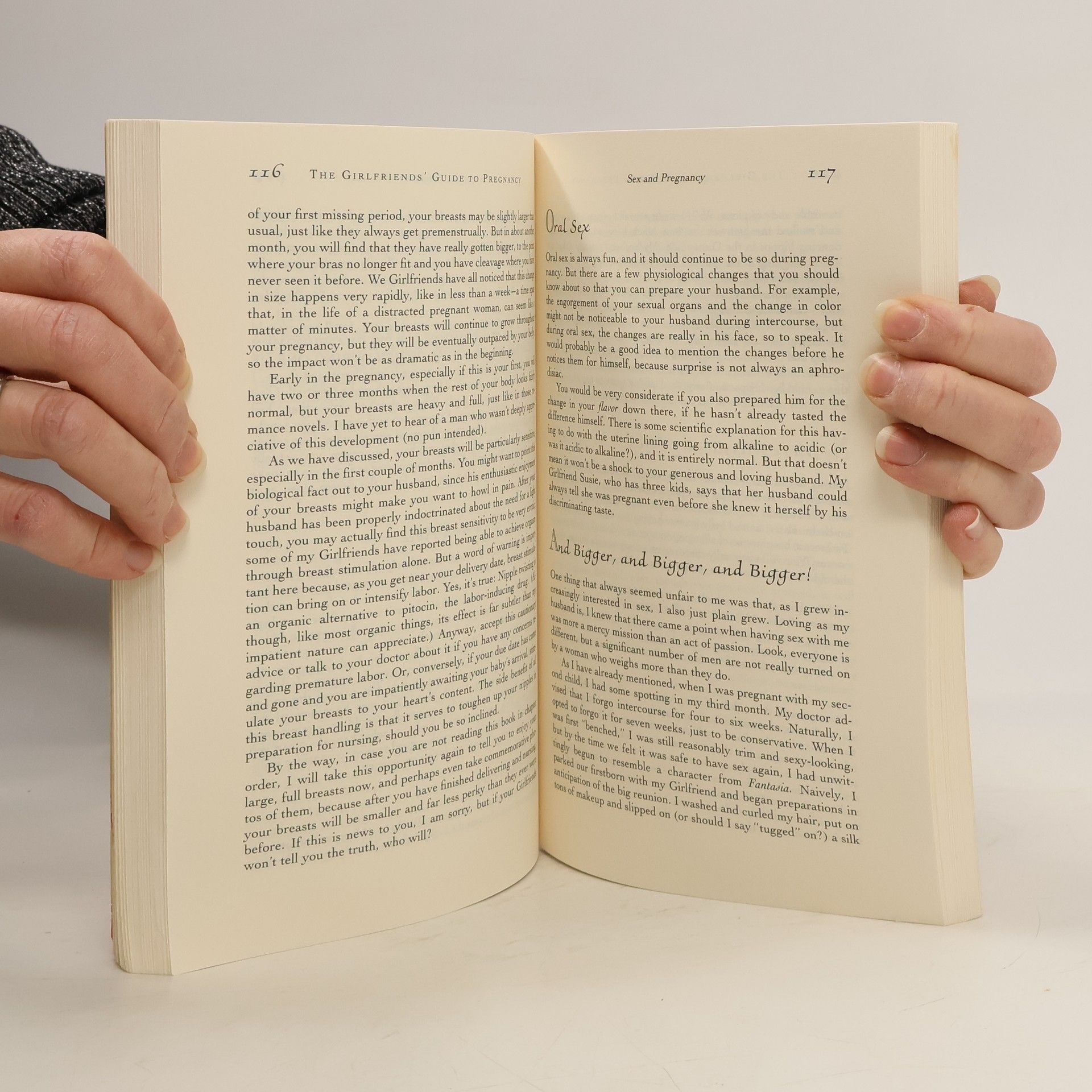 Offers practical, light-hearted advice to pregnant women, including tips on dealing with mood swings, sex during pregnancy, common fears, and physical fitness.