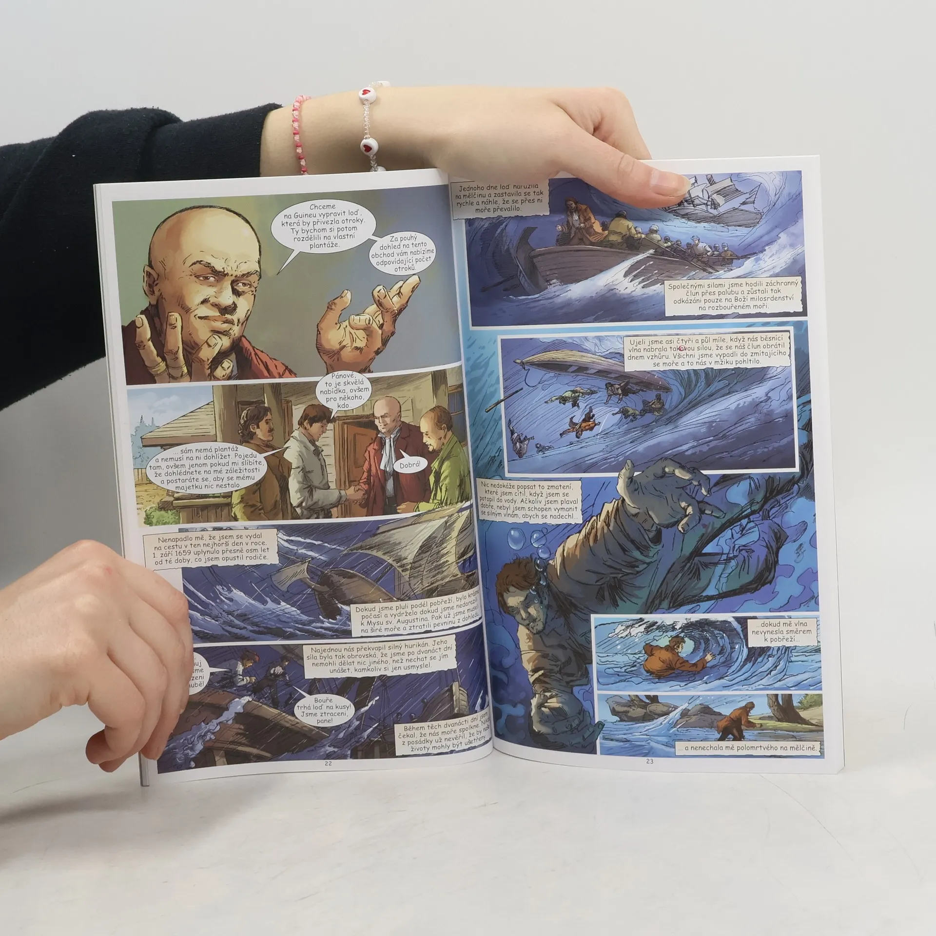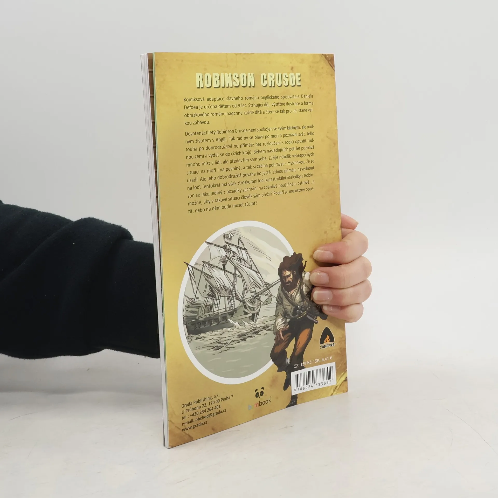 Komiksová adaptace slavného románu anglického spisovatele Daniela Defoa je určena dětem od 9 let. Strhující děj, výstižné ilustrace a forma obrázkového románu nadchne každé dítě a čtení se tak pro něj stane zábavou. Devatenáctiletý Robinson Crusoe není spokojen se svým klidným, ale nudným životem v Anglii. Tak rád by se plavil po moři a poznával svět. Jeho touha po dobrodružství ho přiměje bez rozloučení s rodiči opustit rodnou zemi a vydat se do cizích krajů. Během následujících pěti let poznává mnoho míst a lidí, ale především sám sebe. Zažije několik nebezpečných situací na moři i na pevnině, a tak si začíná pohrávat s myšlenkou, že se usadí. Ale jeho dobrodružná povaha ho ještě jednou přiměje nasednout na loď. Tentokrát má však ztroskotání lodi katastrofální následky a Robinson se jako jediný z posádky zachrání na zdánlivě opuštěném ostrově. Je možné, aby v takové situaci člověk sám přežil? Podaří se mu ostrov opustit, nebo na něm bude muset zůstat?
