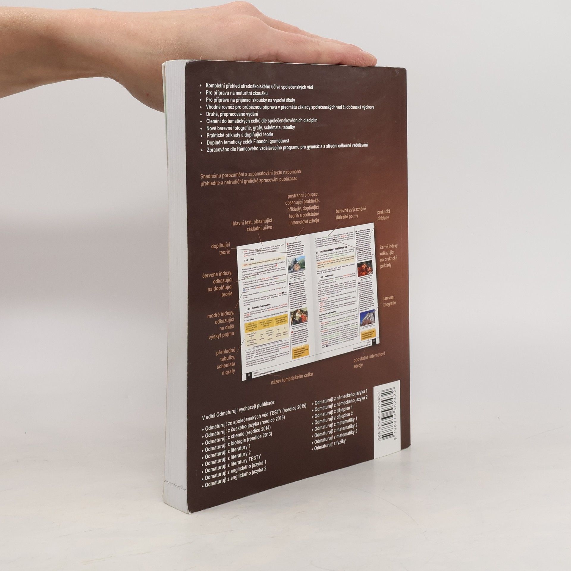 Nakladatelství DIDAKTIS připravuje nové vydání úspěšného titulu Odmaturuj! ze společenských věd z edice Odmaturuj! Edice Odmaturuj! je primárně určena na přípravu k maturitní zkoušce, a to především k maturitní zkoušce v části profilové, taktéž slouží k přípravě na přijímací zkoušky na vysoké školy s humanitním zaměřením. Titul Odmaturuj! ze společenských věd však v novém vydání doporučujeme také pro průběžnou přípravu v předmětu základy společenských věd či občanská výchova na středních školách. I když tituly z edice Odmaturuj! nejsou koncipovány jako učebnice, je do nich zařazeno z hlediska obsahové komplexnosti veškeré středoškolské učivo. Titul je zpracován dle RVP pro gymnázia a RVP pro střední odborné vzdělávání. Nové vydání bude aktualizované podle legislativy účinné k 1. 1. 2015, bude doplněno o nové teoretické poznatky v rámci jednotlivých vědních disciplín a o praktické příklady. Obsah knihy je členěn do následujících tematických celků: Politologie Právo Mezinárodní vztahy Ekonomie Sociologie Psychologie Filozofie Etika Logika a teorie vědy Religionistika Finanční gramotnost Po grafické stránce je důležitou změnou převedení titulu do barevného provedení na bílém podkladu, výklad je doplněn řadou schémat, tabulek a grafů. Nově byl přidán také odkazový aparát v rámci textu a odkazy na podstatné internetové zdroje.