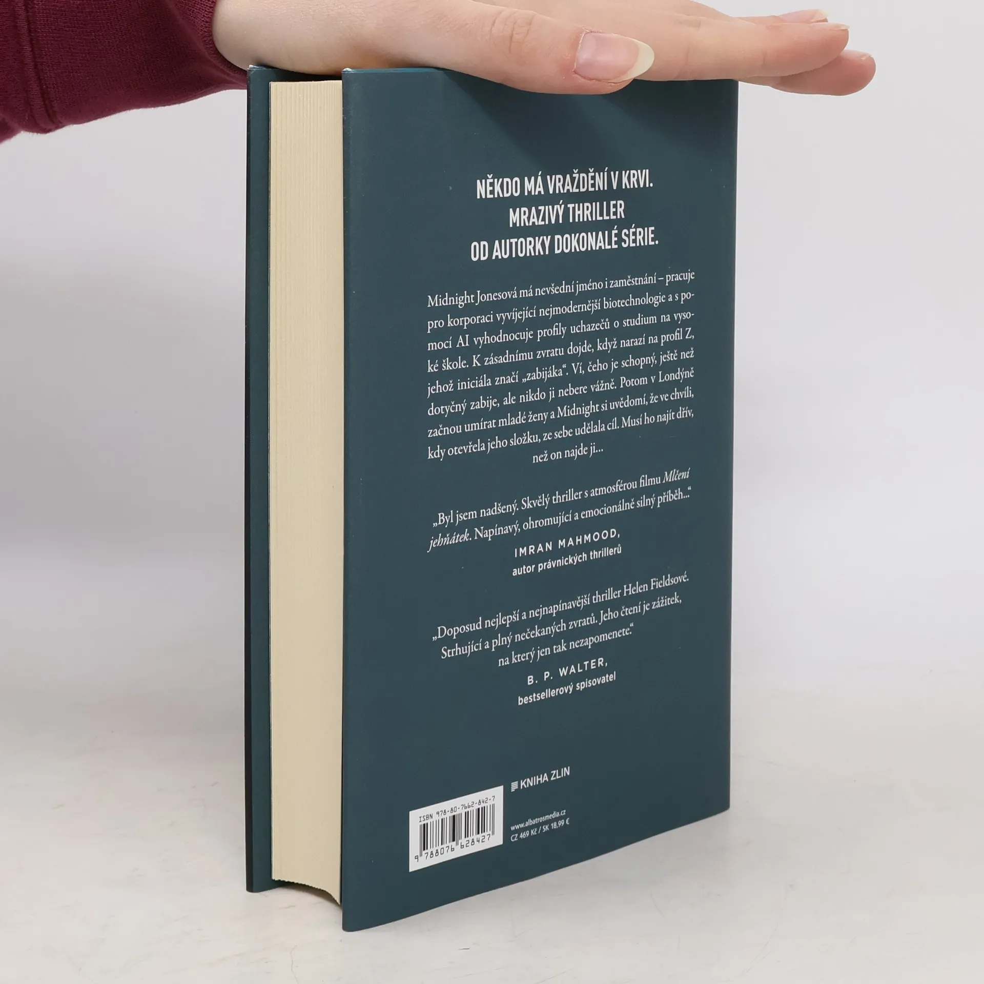 Někdo má vraždění v krvi. Mrazivý thriller od autorky Dokonalé série. Midnight Jonesová má nevšední jméno i zaměstnání – pracuje pro korporaci vyvíjející nejmodernější biotechnologie a s pomocí AI vyhodnocuje profily uchazečů o studium na vysoké škole. K zásadnímu zvratu dojde, když narazí na profil Z, jehož iniciála značí „zabijáka“. Ví, čeho je schopný, ještě než dotyčný zabije, ale nikdo ji nebere vážně. Potom v Londýně začnou umírat mladé ženy a Midnight si uvědomí, že ve chvíli, kdy otevřela jeho složku, ze sebe udělala cíl. Musí ho najít dřív, než on najde ji…