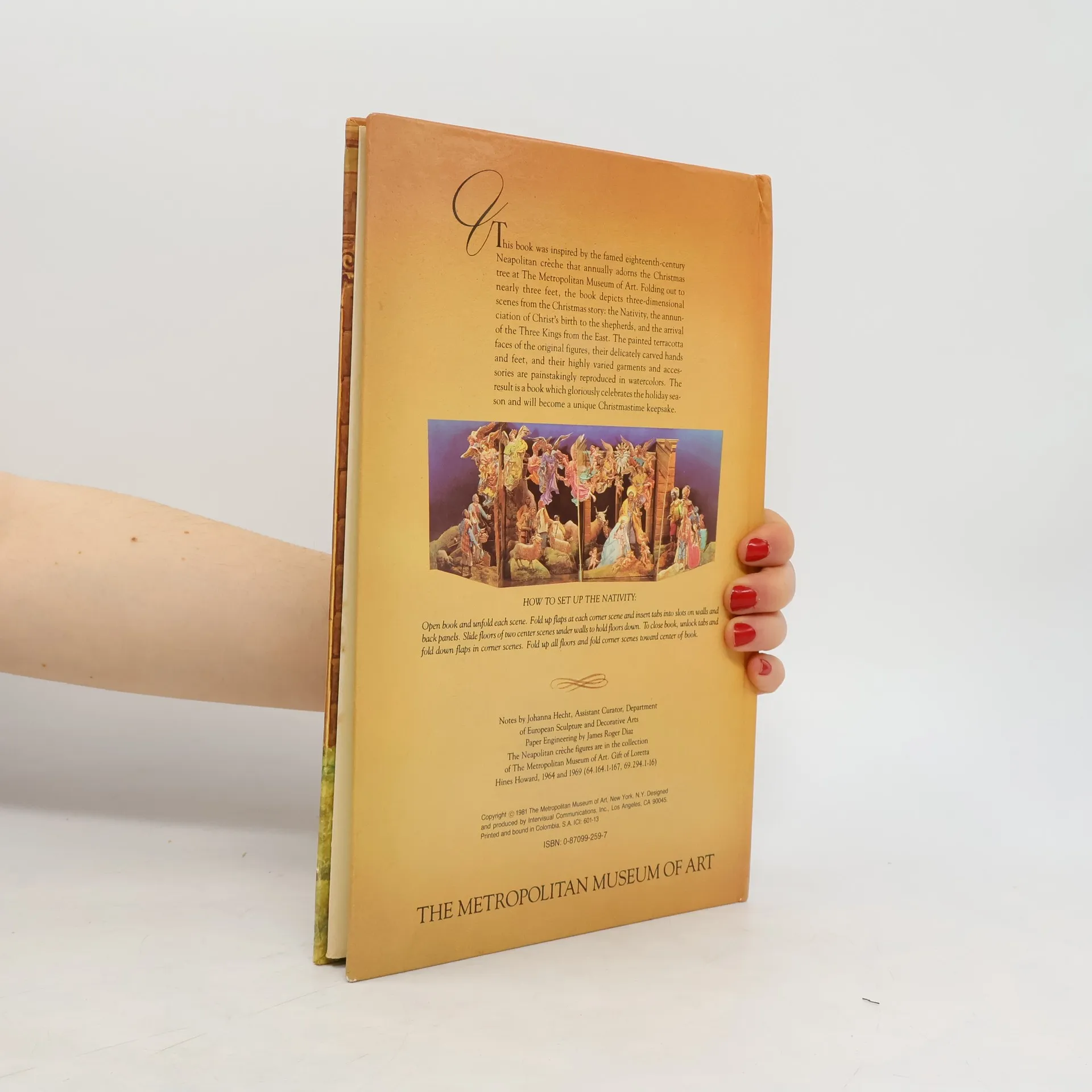 January 1, 1981: Bi-fold Style Pop-Up book folding out to nearly three feet: "The Nativity": Adapted from an Eighteenth-century Neapolitan Christmas Creche Hardcover. Watercolors by Borje Svensson (Author), Johanna Hecht (Notes), James Roger Diaz (Arranger). This book opens for Holiday Display and then can be closed back to book for storage. Our pop-ups have not been opened.