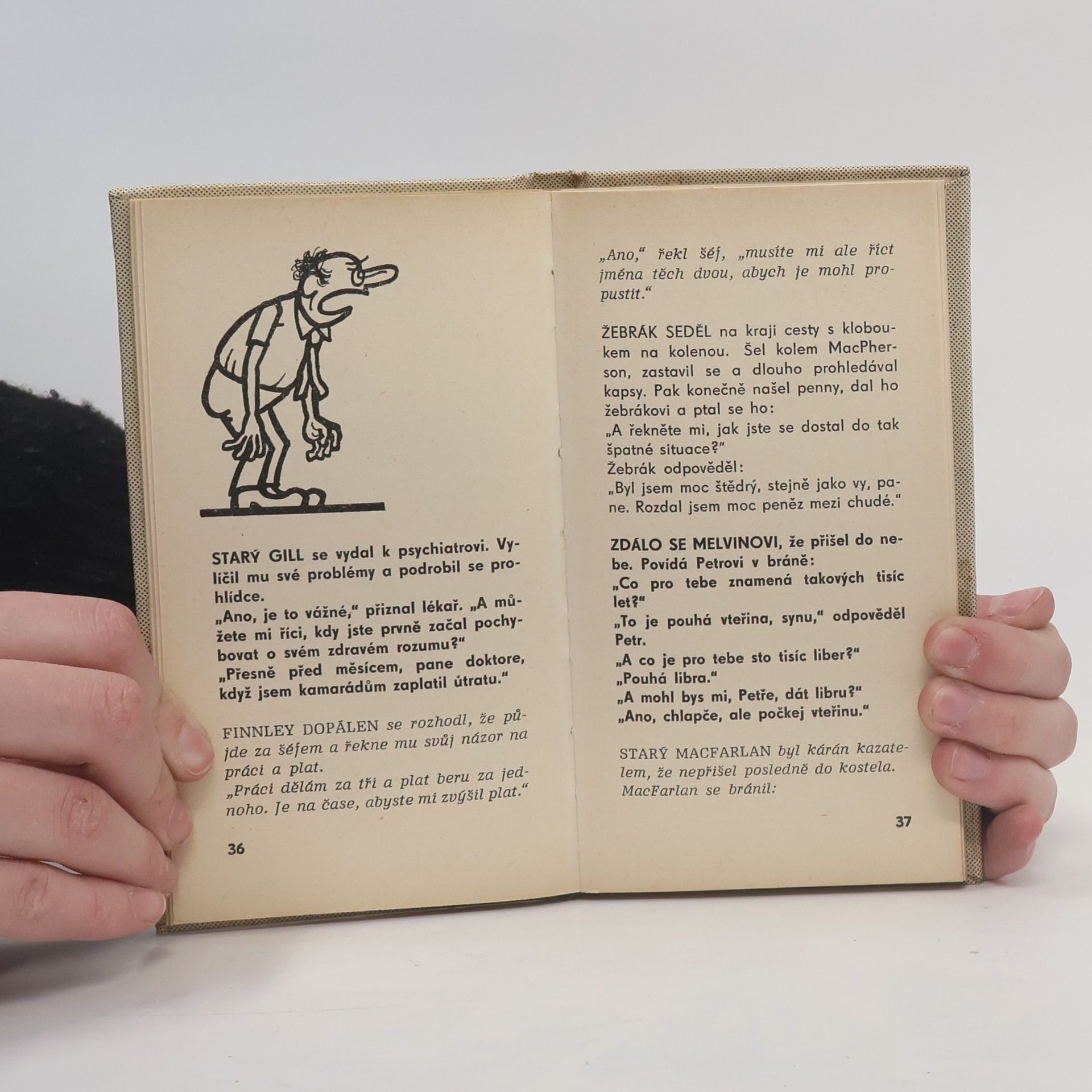 Sbírka anekdot o Skotech a všem skotském. Ilustrace Neprakta. "JE TO PRAVDA, že MacHardy při rybaření převrhl loďku a utonul?" "Ano, jeto smutná pravda. Je dočista mrtev. Představte si, když ho vytáhli a prohlíželi mu kapsy, on se ani nepohnul" "BYL JSTE někdy trestán?" "Bohužel. Platil jsem pokutu za koupání na zakázaném místě." "A od té doby?" "Od té doby jsem se nekoupal" DŮLEŽITÉ UPOZORNĚNÍ na závěr: V poslední době se rozmohly ve všech časopisech skotské anekdoty. Upozorňu- jeme, že nejlepší skotská je - whisky.