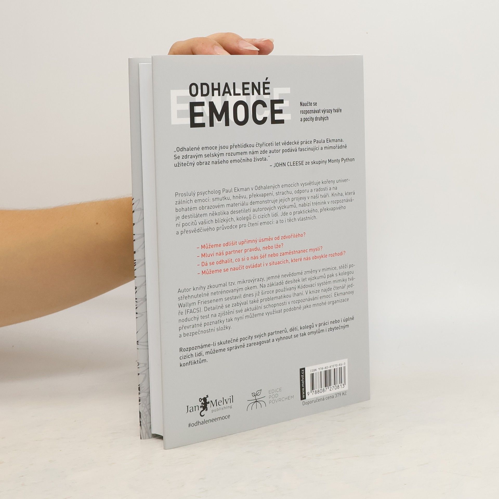 Proslulý psycholog Paul Ekman v Odhalených emocích vysvětluje kořeny univerzálních emocí: smutku, hněvu, překvapení, strachu, odporu a radosti a na bohatém obrazovém materiálu demonstruje jejich projevy v naší tváři. Kniha, která je destilátem několika desetiletí autorových výzkumů, nabízí trénink v rozpoznávání pocitů vašich blízkych, kolegů či cizích lidí. Jde o praktického, překvapivého a přesvědčivého průvodce pro čtení emocí: a to i těch vlastních. Rozpoznáme-li skutečné pocity svých partnerů, dětí, kolegů v práci nebo i úplně cizích lidí, můžeme správně zareagovat a vyhnout se tak omylům i zbytečným konfliktům.
