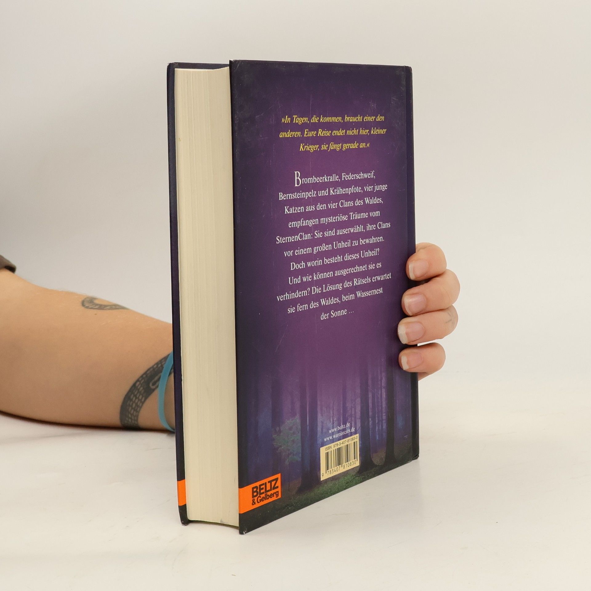 Die neue Prophezeiung: »Finsternis, Luft, Wasser und Himmel werden zusammentreffen... und den Wald bis in seine Wurzeln erschüttern.« »In Tagen, die kommen, braucht einer den anderen. Eure Reise endet nicht hier, kleiner Krieger, sie fängt gerade an.« Brombeerkralle, Federschweif, Bernsteinpelz und Krähenpfote, vier junge Katzen aus den vier Clans des Waldes empfangen mysteriöse Träume vom SternenClan: Sie sind auserwählt, ihre Clans vor einem großen Unheil zu bewahren. Doch worin besteht dieses Unheil? Und wie können ausgerechnet sie es verhindern? Die Lösung des Rätsels erwartet sie fern des Waldes, beim Wassernest der Sonne...