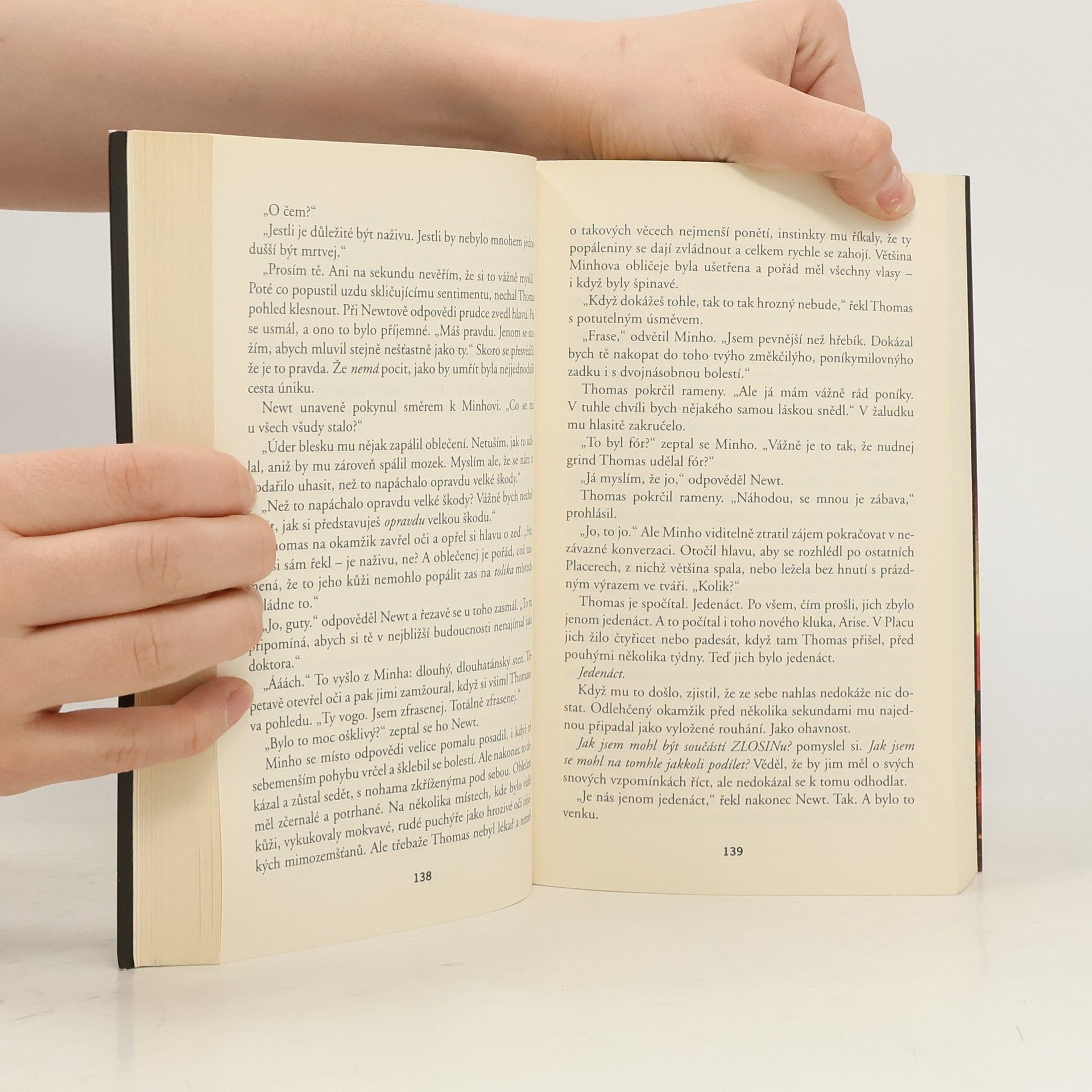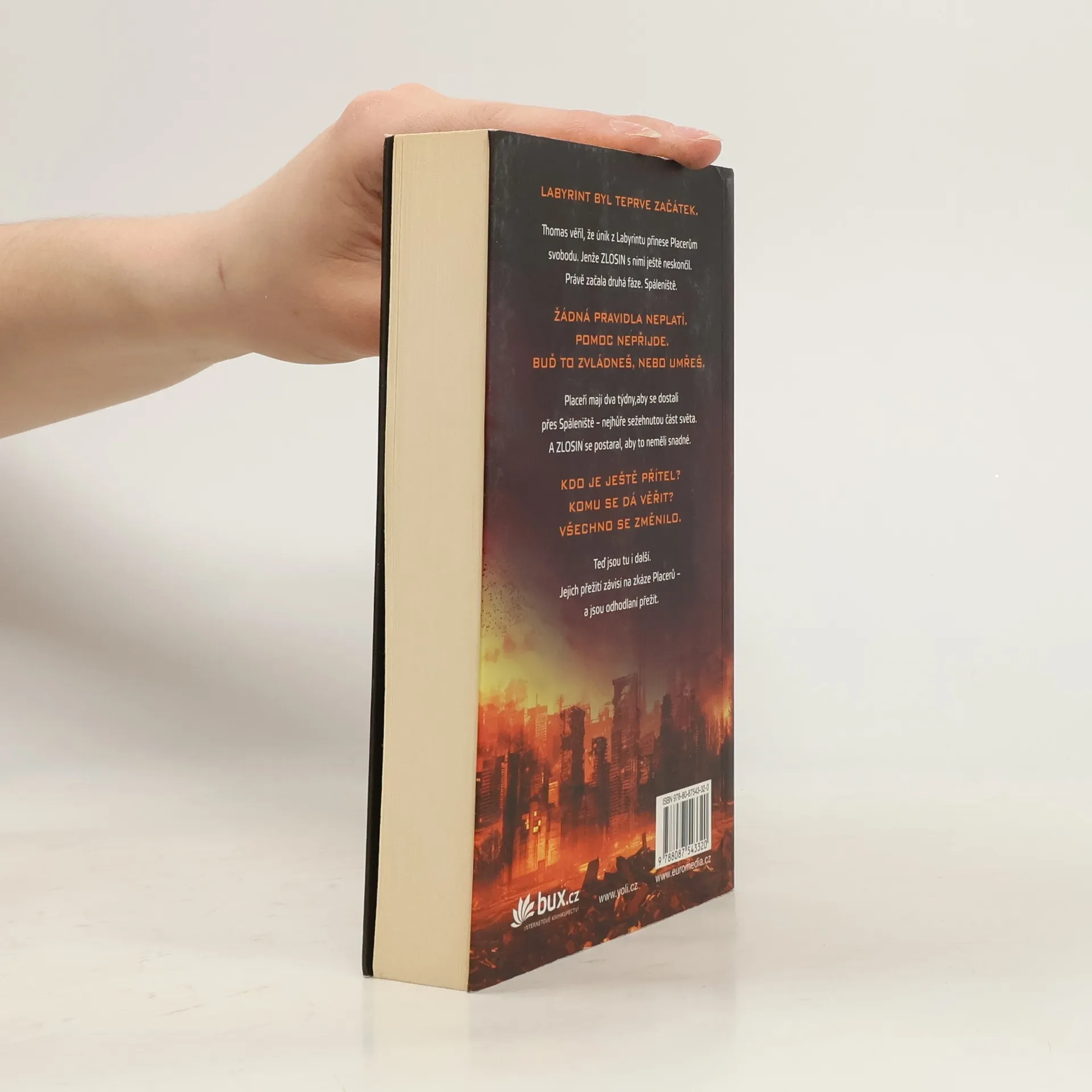 Labyrint byl teprve začátek. Nalezením cesty z labyrintu to mělo skončit... Už žádné hlavolamy. Žádné proměnné. A žádné běhání. Thomas byl přesvědčený, že když se jim podařilo uniknout, vrátí se on i Placeři ke svým dřívějším životům. Nikdo však ve skutečnosti netušil, do jakého života se vracejí. Země, sežehnutá slunečními erupcemi a spálená novým, krutým klimatem, se změnila v pustinu. Vláda se zhroutila – a s ní i pořádek. Rozpadajícími se městy teď bloudí „raplové“, lidé pokrytí hnisavými ranami, které infekční nemoc nazývaná erupce dohání k vražednému šílenství. Hledají, kde by našli další oběť... a potravu. Pro Placery běhání zdaleka neskončilo. Namísto svobody zjišťují, že mají před sebou další zkoušku. Musejí překonat Spáleniště, nejvíc sežehnutou část planety, a do dvou týdnů dorazit do bezpečného útočiště. A organizace ZLOSIN se postarala o to, aby uzpůsobila proměnné a nastavila šance v jejich neprospěch. Thomase čeká zkouška ohněm – skutečně přechovává někde v hlavě tajemství svobody? Nebo bude věčně vydán ZLOSINu na milost?