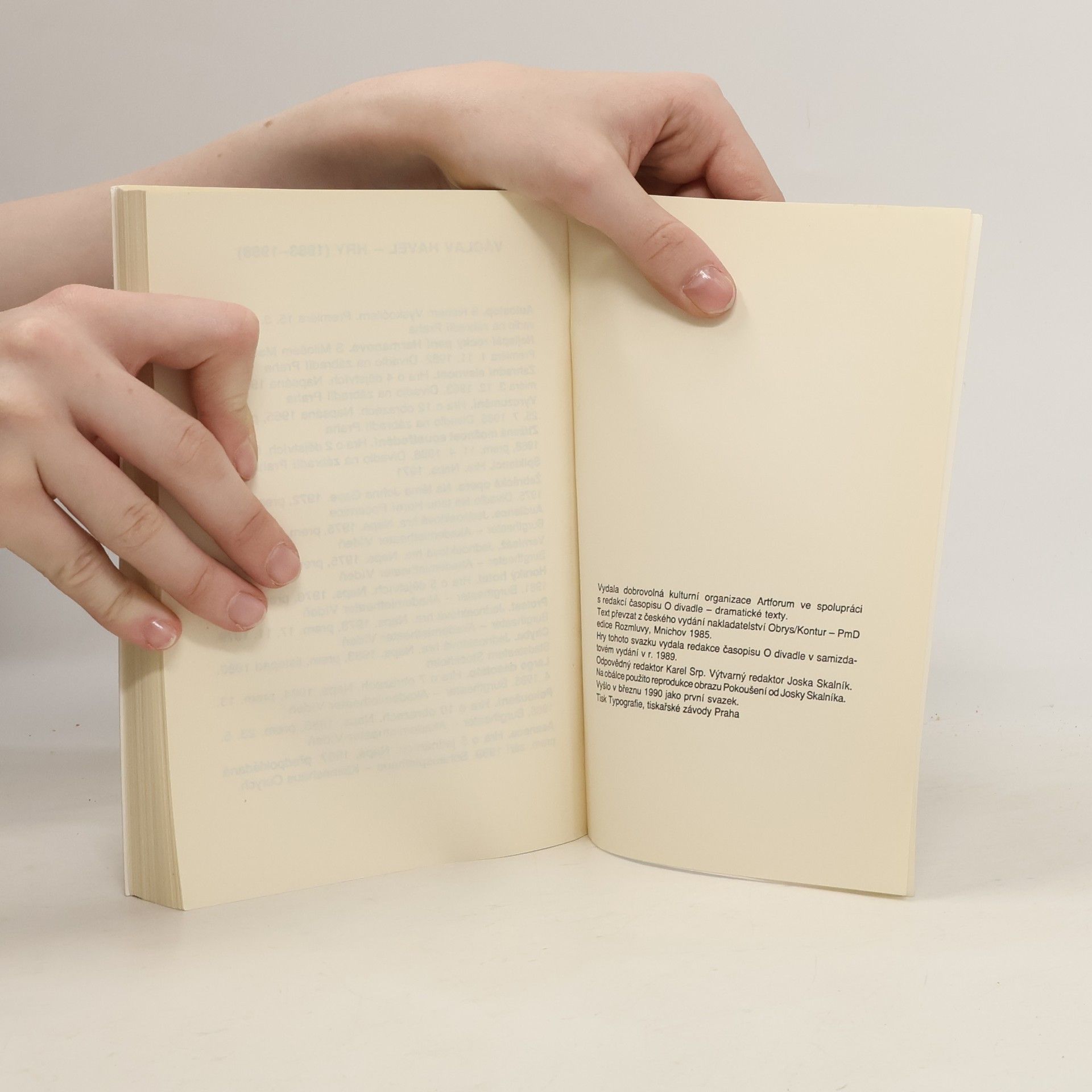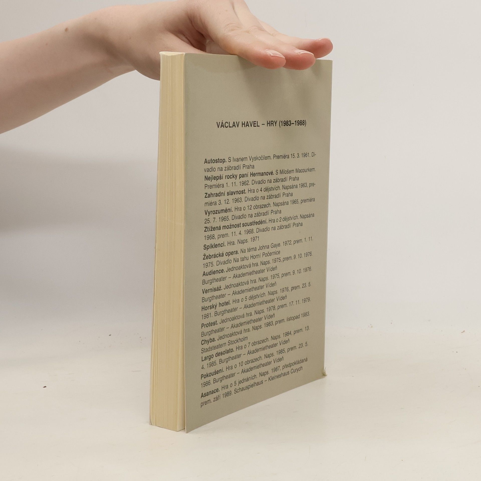 Reprezentativní soubor her Václava Havla (1936–2011) zastupuje v České knižnici nejen disidentskou tvorbu coby platformu pro vytyčování závažných společenských a politických otázek současnosti i budoucnosti. Zvolená koncepce svazku představuje Havlovu tvorbu v jejích čtenářsky i divácky oblíbených, dnes už klasických dílech, proslulých úspěšnými jevištními realizacemi na domácích i zahraničních scénách. Z autorova raného tvůrčího období přináší Zahradní slavnost, Vyrozumění a Ztíženou možnost soustředění, následují hry z doby disentu Žebrácká opera, Audience, Vernisáž, Largo desolato a Pokoušení.