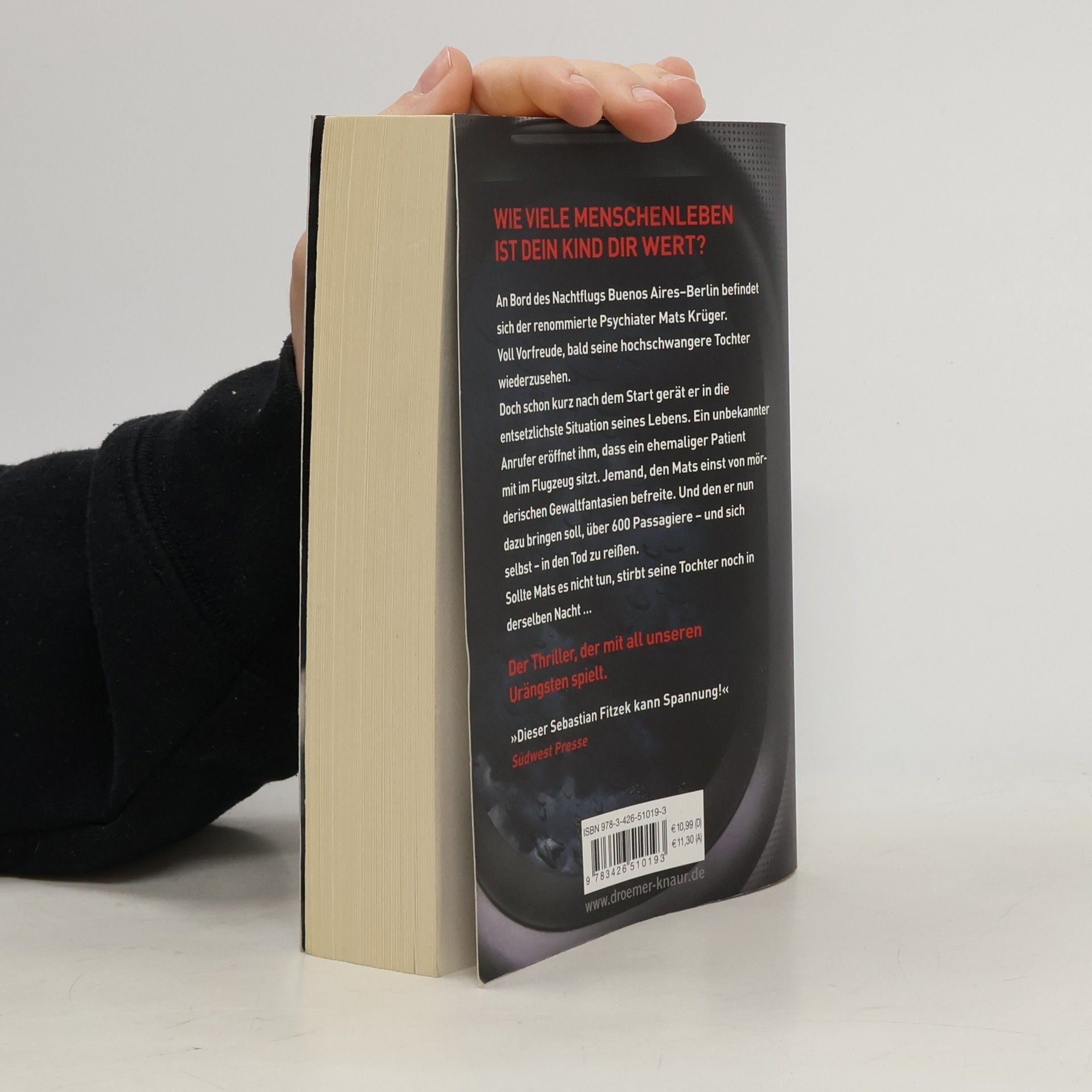 In diesem Psychothriller von Bestseller-Autor Sebastian Fitzek geht es um die tiefsten menschlichen Ängste des Eingeschlossenseins und der Hilflosigkeit in einem Flugzeug. Mats Krüger, ein erfolgreicher Psychiater, muss seine panische Flugangst überwinden, als seine hochschwangere Tochter Nele nach Jahren des Schweigens Kontakt zu ihm aufnimmt. Mats, der nach dem Tod seiner Frau nach Argentinien ausgewandert ist, wird gebeten, nach der Geburt des Babys zu helfen. Nach einem Flugangst-Seminar besteigt Mats den Langstreckenflug von Buenos Aires nach Berlin. Kurz nach dem Einnehmen seines Platzes wird ihm klar, dass er sich auf die falschen Ängste vorbereitet hat. Es sind nicht Turbulenzen oder Terrorwarnungen, die ihn in einen seelischen Ausnahmezustand versetzen, sondern ein Anruf eines Unbekannten. Dieser informiert ihn, dass sich ein ehemaliger Patient an Bord befindet, jemand, den Mats einst von mörderischen Gewaltphantasien befreite. Nun wird Mats gezwungen, zu verhindern, dass dieser Patient über 600 Passagiere und sich selbst in den Tod reißt. Ein packender Thriller, der die Grenzen der Psyche auslotet.