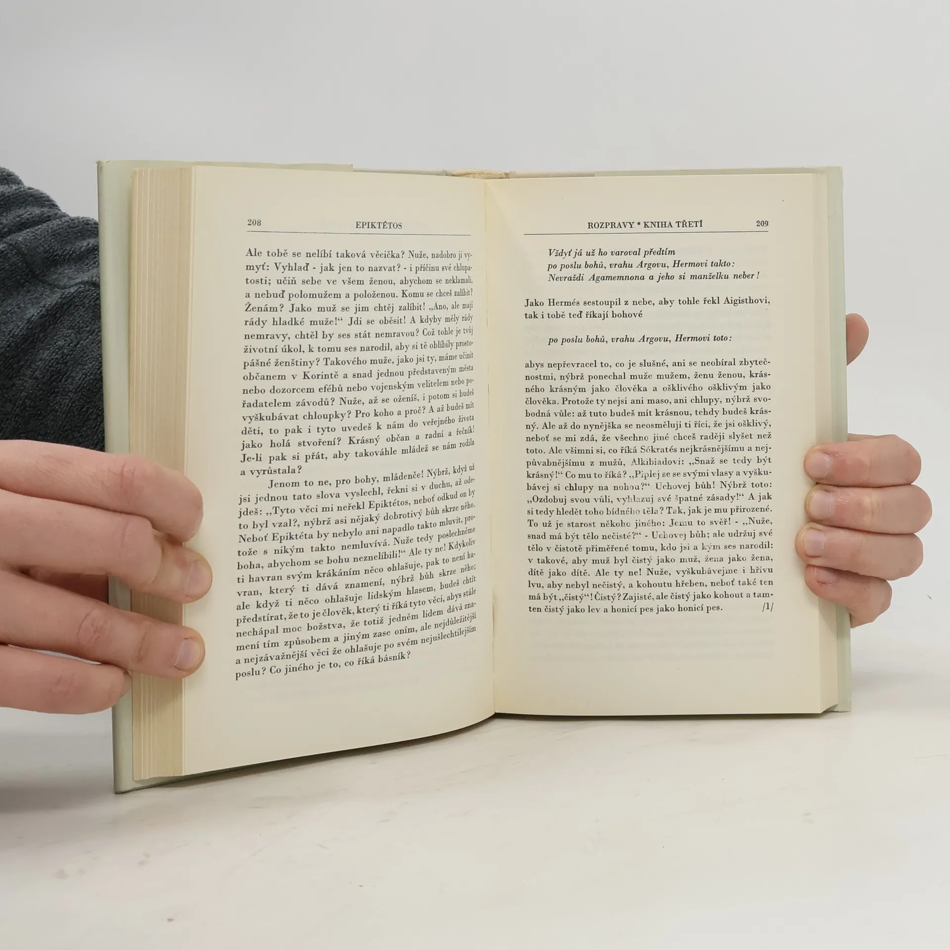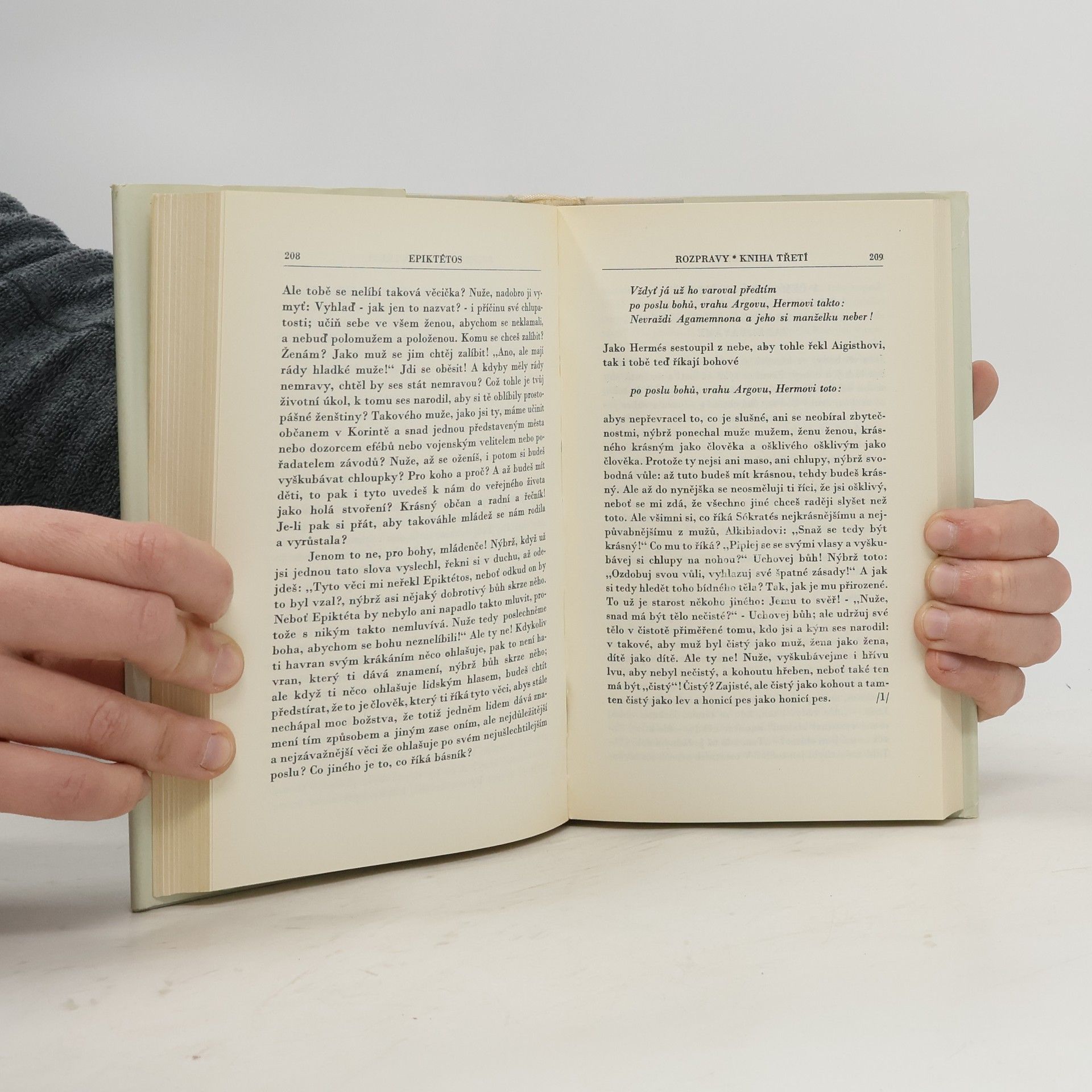 Epiktétova nauka o mravním jednání, zejména o mravní sebevýchově člověka, podává po způsobu takzvané diariblé, filosofické rozpravy, čas od času kořeněné anekdotami, citáty z básníků, názornými a mnohdy drastickými příklady, alegoriemi, apostrofami, personifikacemi a zejména hojnýmidialogy, neztratila podnes na své působnosti a na ceně.