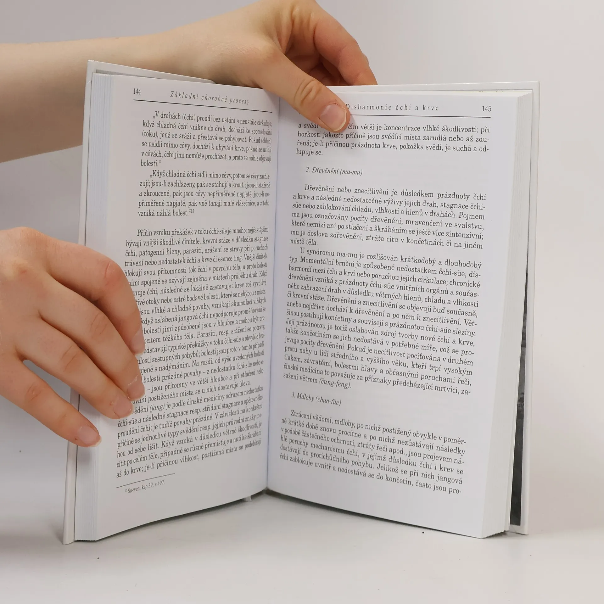 Další rozsáhlý tematický okruh základní teorie čínské medicíny představuje učení o příčinách nemocí, etiologie. Celostní přístup vede k odhalování spojitostí na první pohled nesouvisejících. KAPITOLA VI – PŘÍČINY ONEMOCNĚNÍ Vnější příčiny onemocnění Šest rozvracečů Nákaza Paraziti Vnější poranění Vnitřní příčiny poranění Sedm nemocí Potrava Aktivita a odpočinek Ostatní příčiny onemocnění Hleny Krevní stáze Vrozené příčiny KAPITOLA VII – CHOROBNÉ PROCESY Vznik nemoci Střídavé převažování se řádné a škodlivé čchi Faktory ovlivňující řádnou čchi Všeobecné zákonitosti vzniku a vývoje nemoci Základní chorobné procesy Přesila a oslabenost škodlivého a správného Disharmonie jin-jangu Disharmonie stoupání a klesání Disharmonie čchi a krve Disharmonie metabolismu tekutin Chorobné procesy u horečnatých onemocnění z vnějších příčin Chorobné procesy u šesti drah Chorobné procesy ve vrstvách ochrany, čchi, výživy a krve Chorobné procesy u tří zářičů Chorobné procesy z pěti vnitřních škodlivostí Uvnitř se hýbe větrná čchi Zevnitř se rodí chlad Uvnitř se rodí vlhké kaly Zranění tekutin generuje sucho Uvnitř se rodí ohnivá horkost Chorobné procesy v síti drah čchi Chorobné procesy u orgánů cang-fu Chorobné procesy u orgánů cang Chorobné procesy u orgánů fu Chorobné procesy u zvláštních orgánů fu Interakce chorobných procesů u orgánů cang-fu DODATKY Rejstřík čínských slov