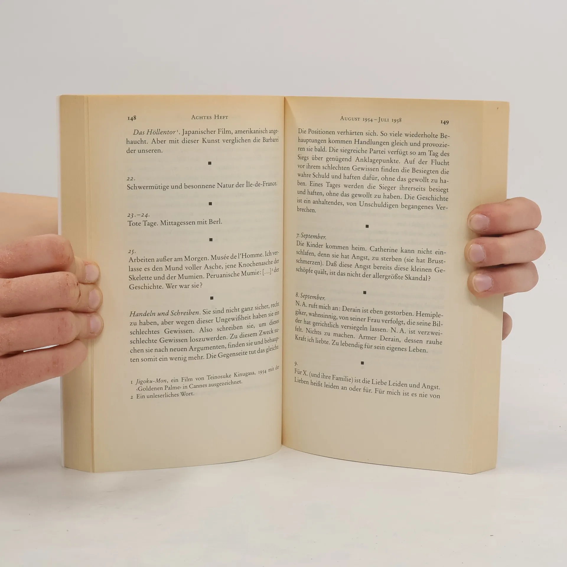Die Tagebuchaufzeichnungen von Albert Camus, die erst drei Jahrzehnte nach seinem Tod veröffentlicht wurden, bieten Einblicke in sein Werk, seine Biografie und seine Beziehung zu Sartre. Sie thematisieren Einsamkeit, das Todesmotiv und ein geheimes Leitmotiv: die Unfähigkeit zu lieben.