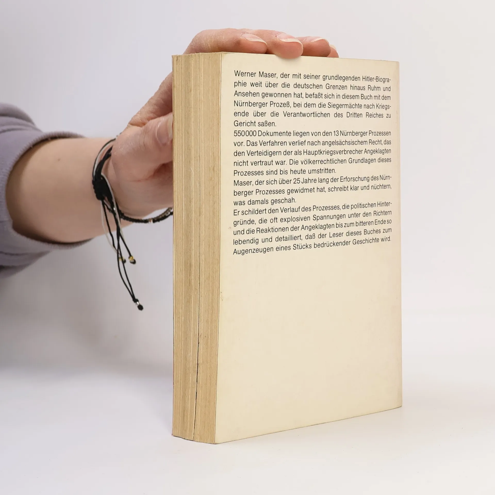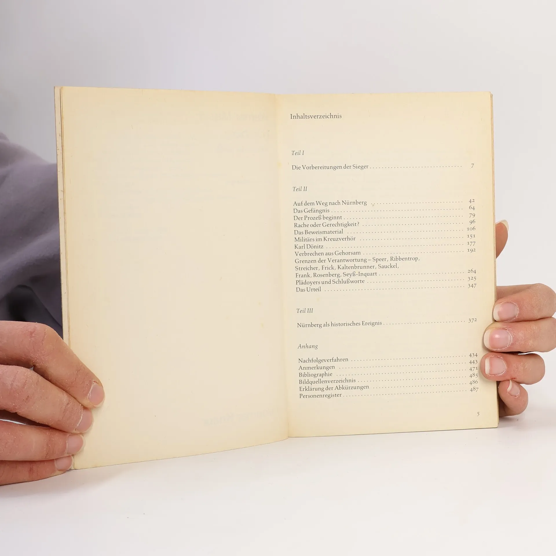 Tysk militærhistorie. Om Nürnberg-processerne med krigsforbryderdomstolene overfor de tyske nazister, i 1946, efter afslutningen af 2. Verdenskrig. Bogens kapiteloverskrifter: 1. Die Vorbereitungen der Sieger. 2. Aus dem Weg nach Nürnberg. 3. Das Gefängnis. 4. Der Prozes beginnt. 5. Rache oder Gerechtigkeit? 6. Das Beweismaterial. 7. Militärs im Kreuzverhör. 8. Karl Dönitz. 9. Verbrechen aus Gehorsam. 10. Grenzen der Verantwortung - Speer, Ribbentrop, Streicher, Frick, Kaltenbrunner, Sauckel, Frank, Rosenberg, Seys-Inquart. 11. Plädoyers und Schlusworte. 12. Da Urteil. 13. Nürnberg als historisches Ereignis.